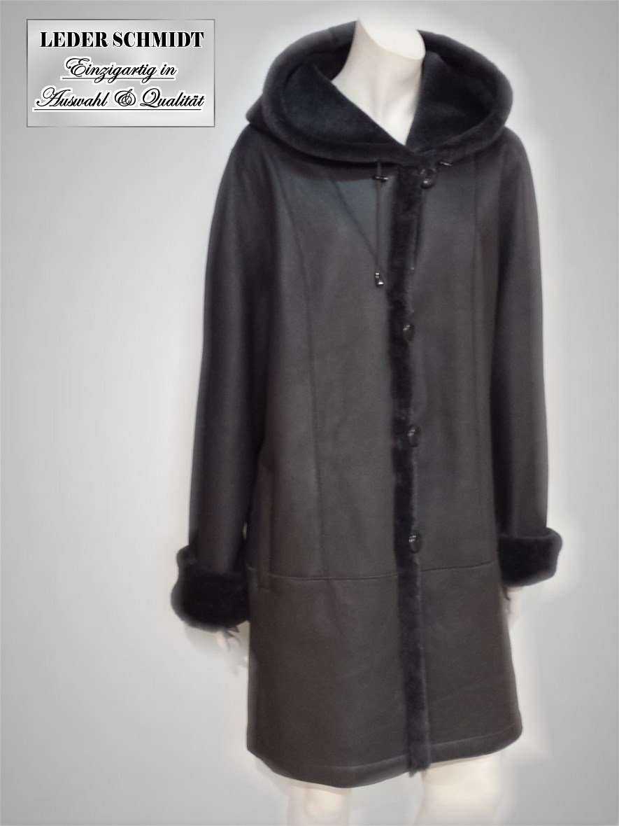 Damen Lammfelljacke lang in spanischem Merino-Lammfell mit voll Nappierung (außen glatt). Diese federleichte Lammfelljacke (ca.1,5kg) mit Kapuze. Die Kapuze hat ein Kordelband, & das Modell ist mit Knöpfen schließbar. Lange Ärmellänge, die durch Umschläge einstellbar sind. Zwei Einschubtaschen und eine Innentasche mit Reißverschluss vorhanden.