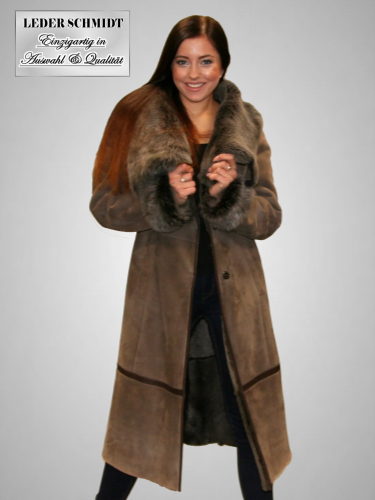 Attraktiver sehr leichter Damen Lammfellmantel in Merino-Lammfell (Pelz-Velour). Seitliche Einschubtaschen, taillierter & figurbetonter Schnitt. Toskana-Lammfell am Kragen und an den Ärmelenden verarbeitet. Ärmellänge ist durch Umschlag einstellbar. Modell ist ca.173cm groß.