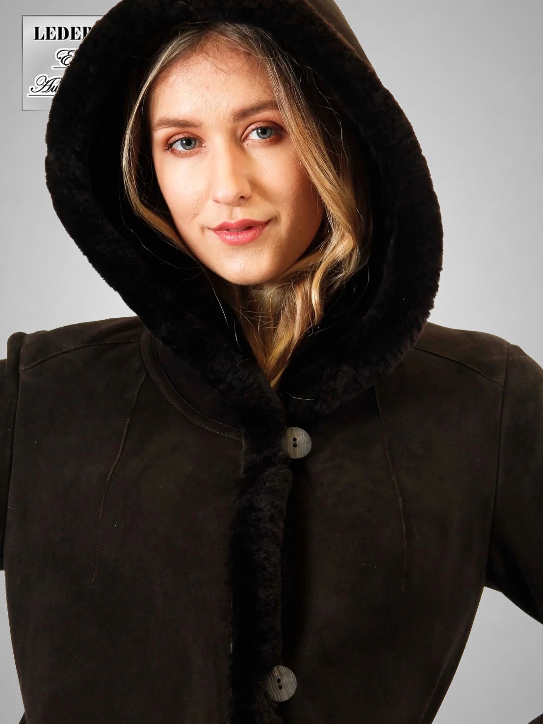 Lange, leicht figurbetonte Damenlammfelljacke dunkel-braun in spanischem Merino-Lammfell.