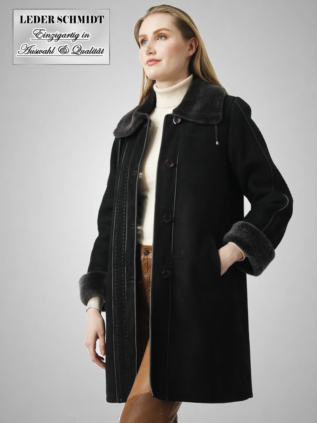 Schlichte Eleganz mit dem gewissen Pfiff durch zwei Musterstreifen als Blickfang präsentiert sich diese Damen Lammfelljacke