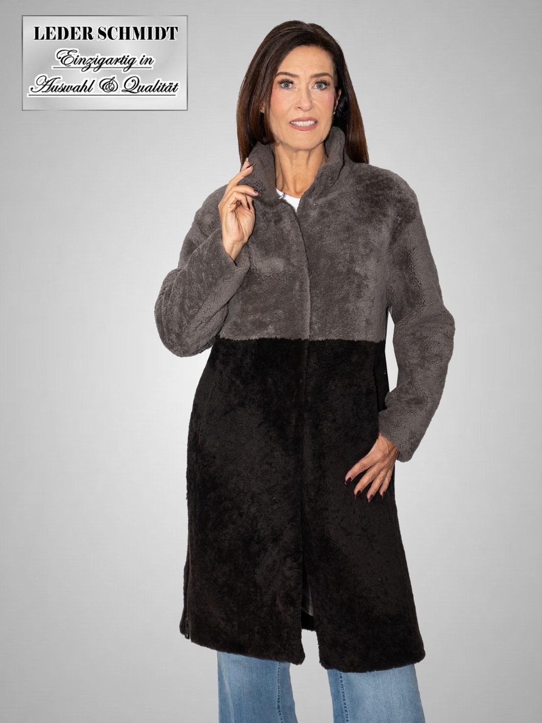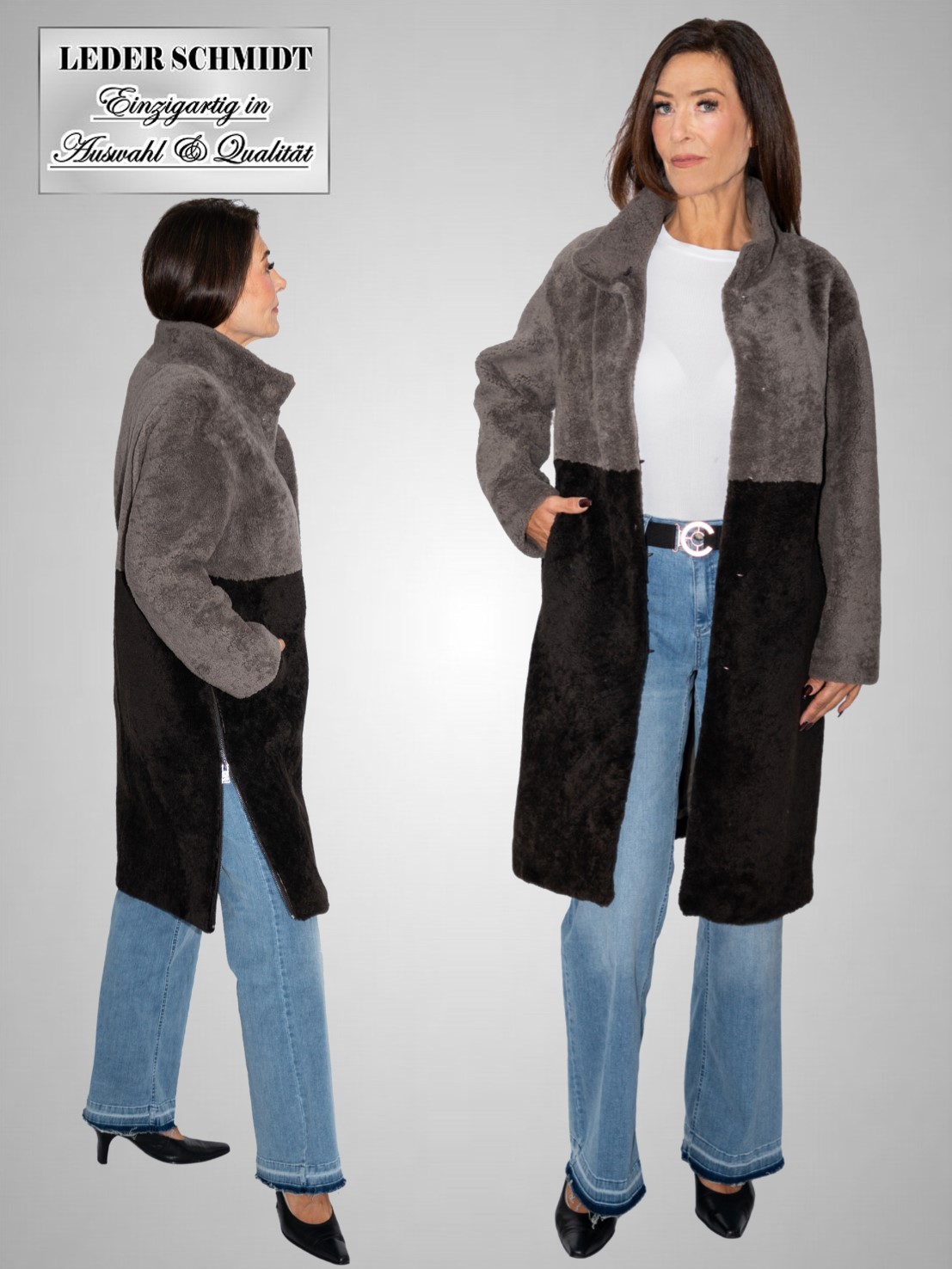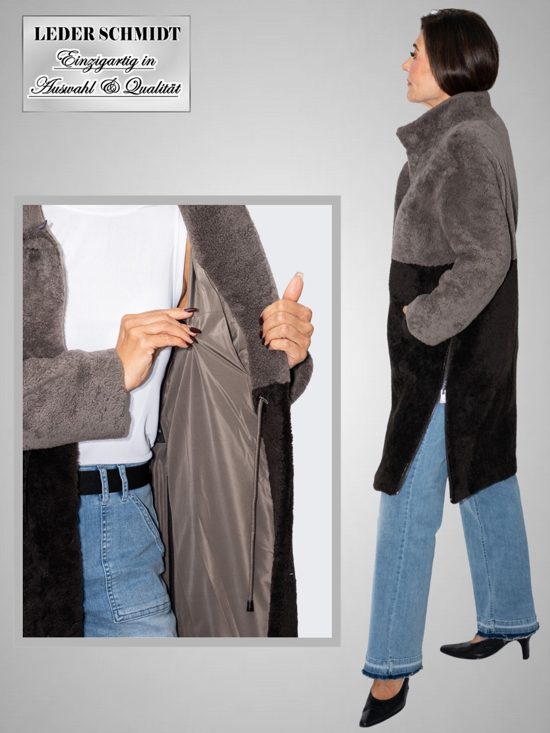 Dieser stylische Damen Lammfellmantel sorgt nicht nur für einen schicken Look, sondern auch für wärmenden Komfort. Die zweifarbige Gestaltung in den Farben Taupe und Coffee ermöglicht viele Kombinationsmöglichkeiten. Der Mantel wird mit Pelzhaken geschlossen, der Stehkragen besitzt einen Magnetverschluss. Das Modell hat zwei Einschubtaschen und eine Innentasche. Durch einen innenseitigen Taillentunnelzug können sie individuell ihre Silhouette betonen. Praktische hohe Seitenreißverschlüsse komplettieren Funktionalität und Design.
