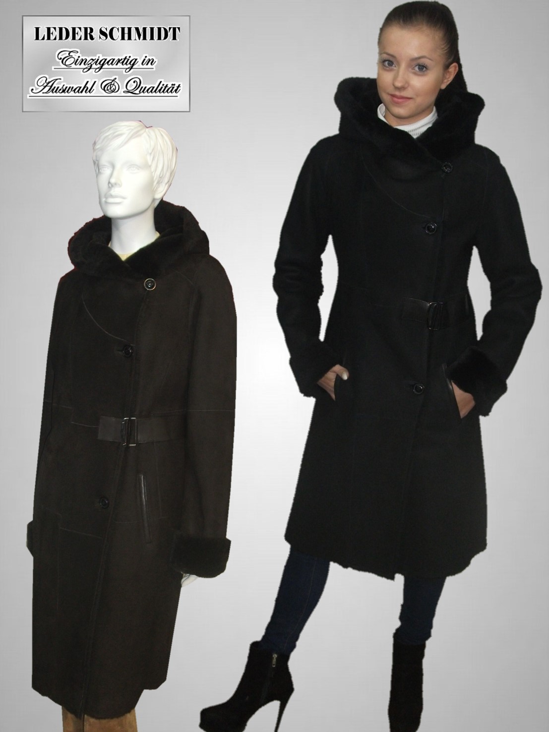 Der Damen Lammfellmantel mit Kapuze.