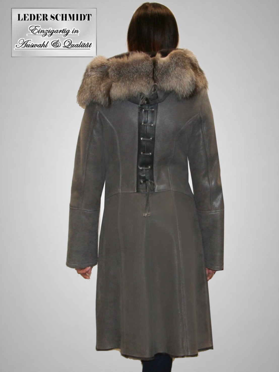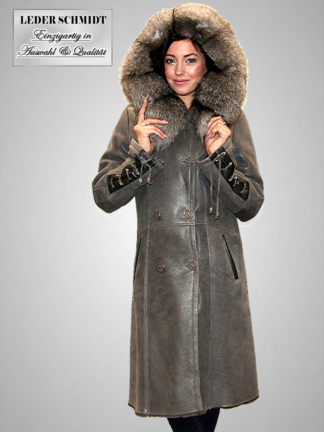 Damen Lammfellmantel mit Kapuze in Spanisch Entrefino der Spitzenklasse mit leichter Nappierung (ganz leichter Glanz). Das Modell hat zum Schließen Knöpfe. Die oppulente Kapuze ist mit einem edlem Silberfuchs-Pelzbesatz veredelt. Dieser Mantel ist figurbetont und als Zweireiher gearbeitet. Ein Blickfang sind die geschnürten Ledereinsätze an Ärmeln, Rücken und Kapuze.