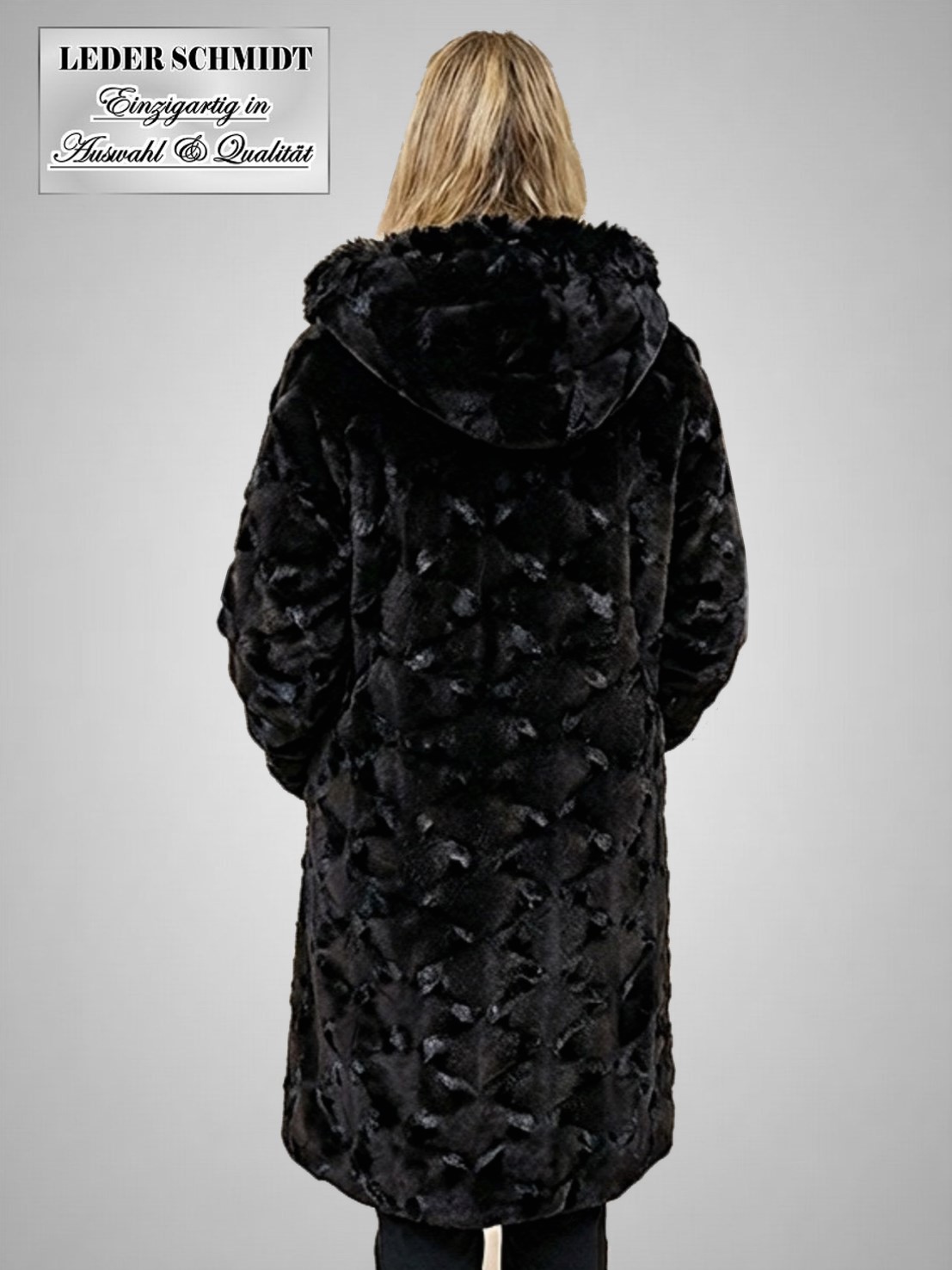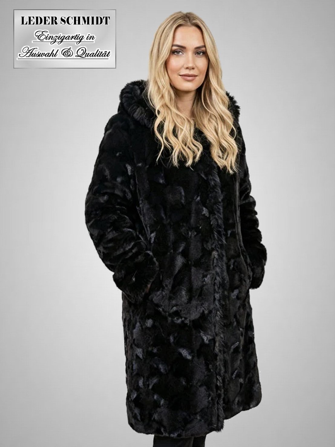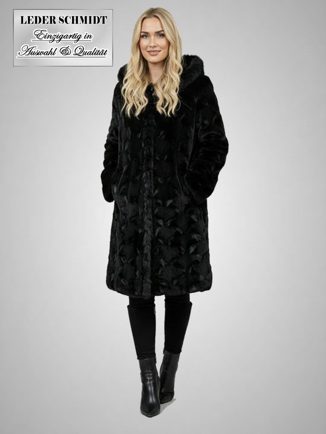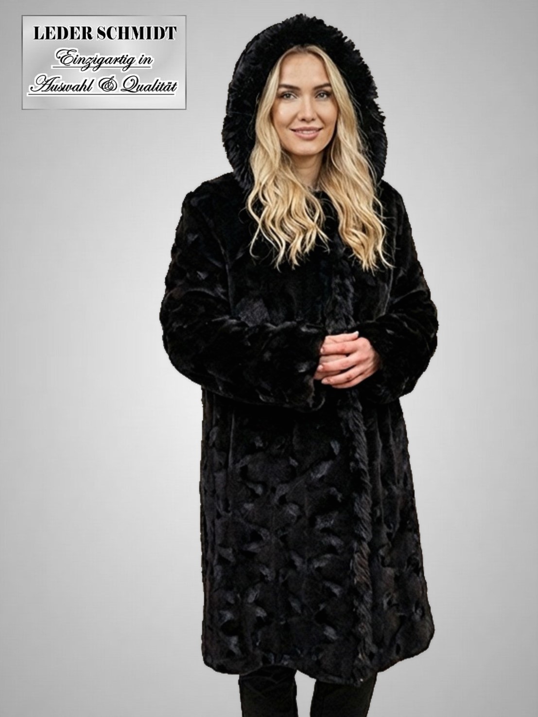 Leichter exklusiver langer Damen Nerzmantel mit Kapuze. Aufwendige Verarbeitung der Pelzseiten, aus einem wunderschönen Mosaikmuster.
