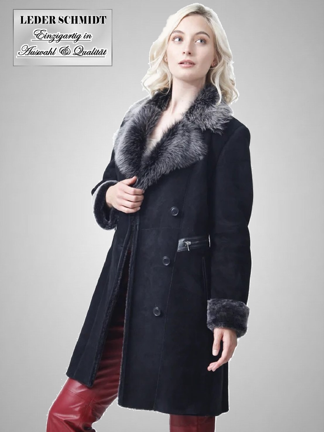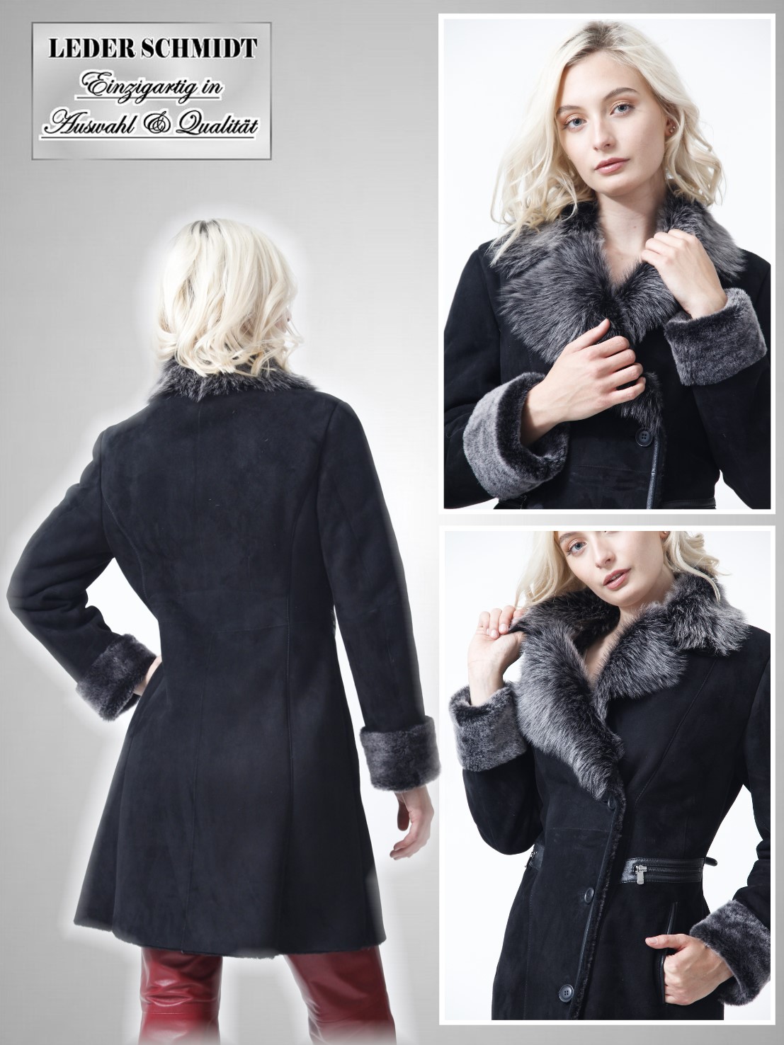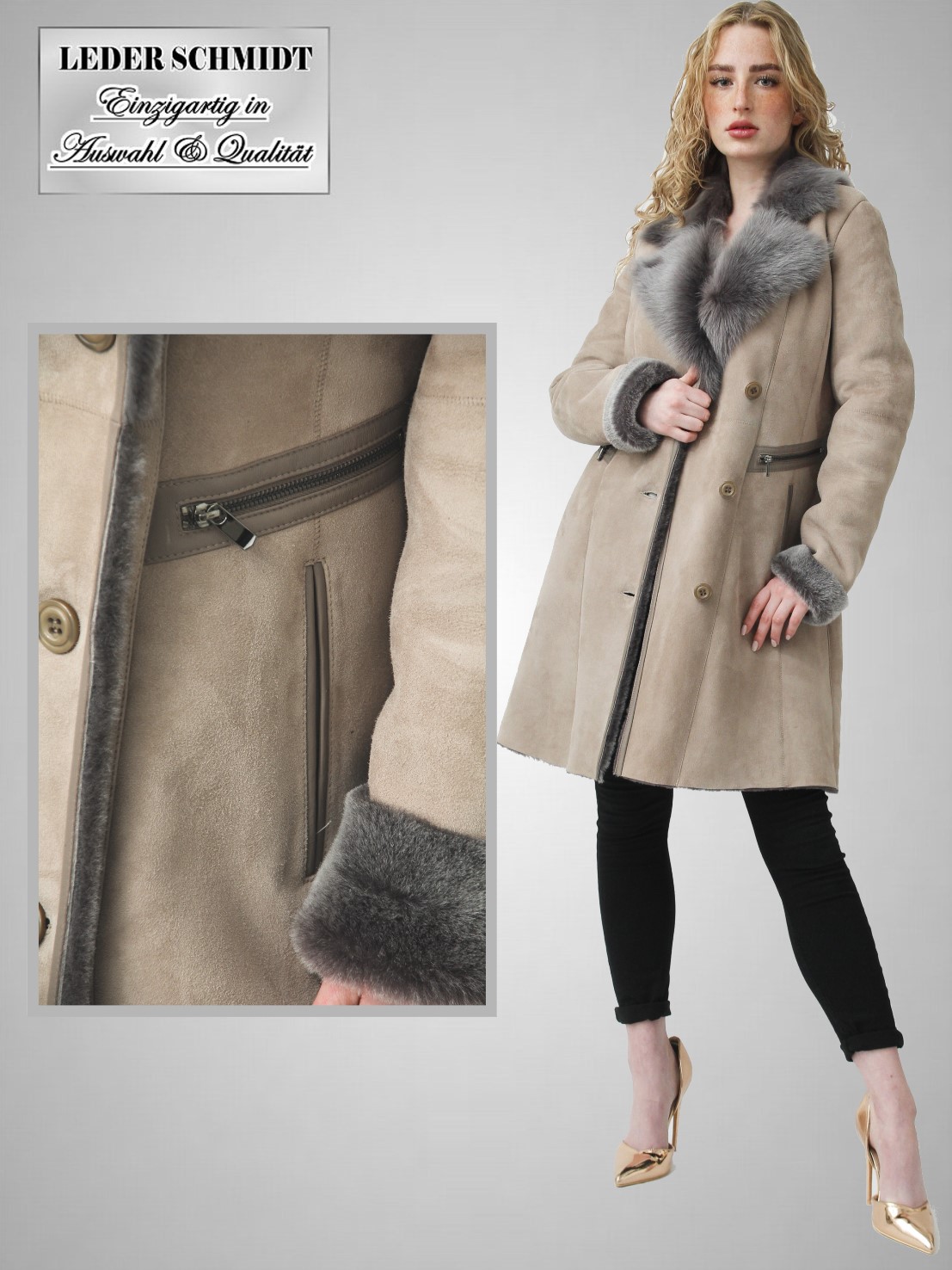 Der Toskana-Lammfell-Kragen ist hoch schließbar und die Ärmelenden durch einen Umschlag einstellbar. Diese Lammfelljacke hat zwei Einschubtaschen und eine Innentasche.