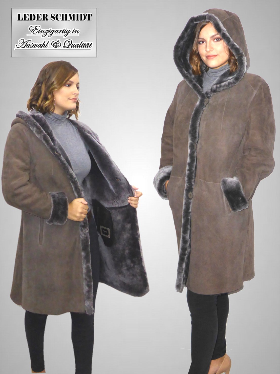 Lange, leicht figurbetonte Damenlammfelljacke in spanischem Merino-Lammfell in Pelzvelours.