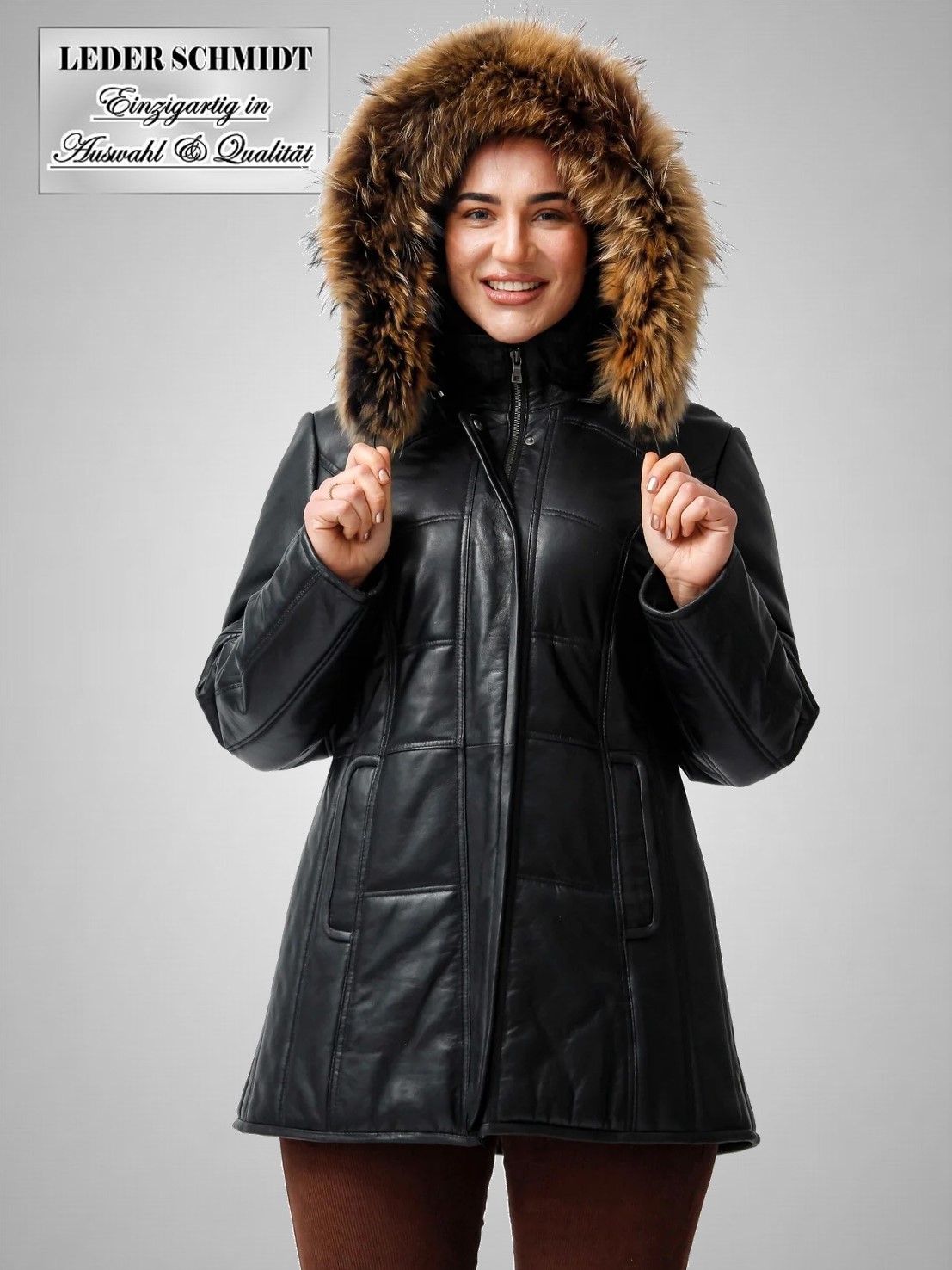 Wunderschöner, warm gesteppter Damenlederparka mit Kapuze und Fuchsverbrämung aus weichem Lammnappa.