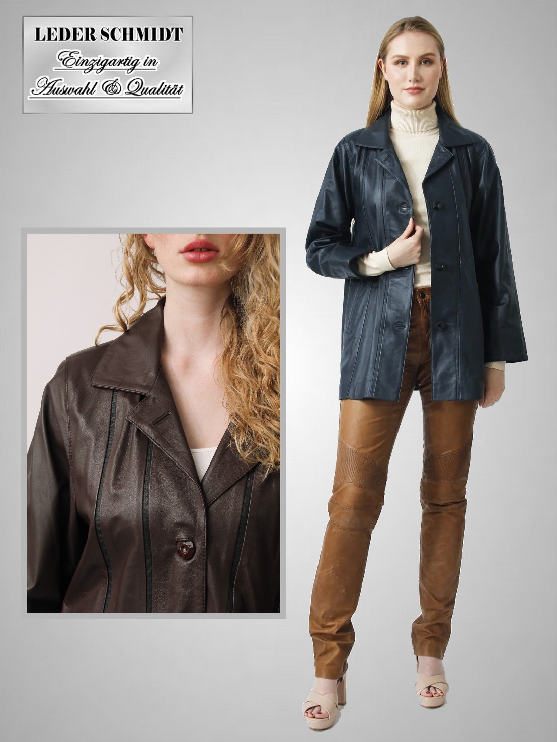 Diese Damen Lederjacke ist der ideale Begleiter in der Übergangszeit. Das Modell ist in leichter A-Form geschnitten.
