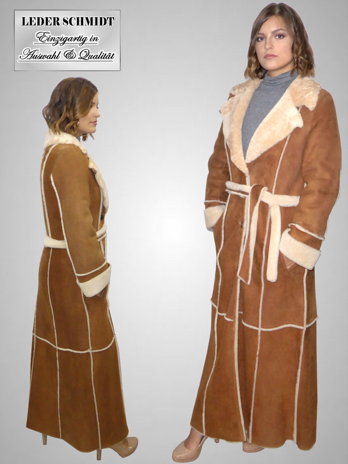 Attraktiver langer leichter Damen Lammfellmantel in Merino-Lammfell (Pelz-Velour) mit Gürtel.