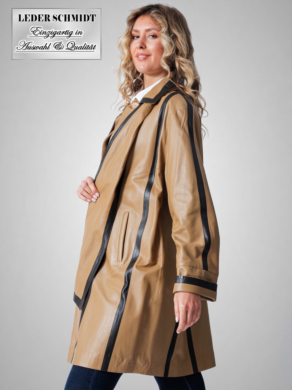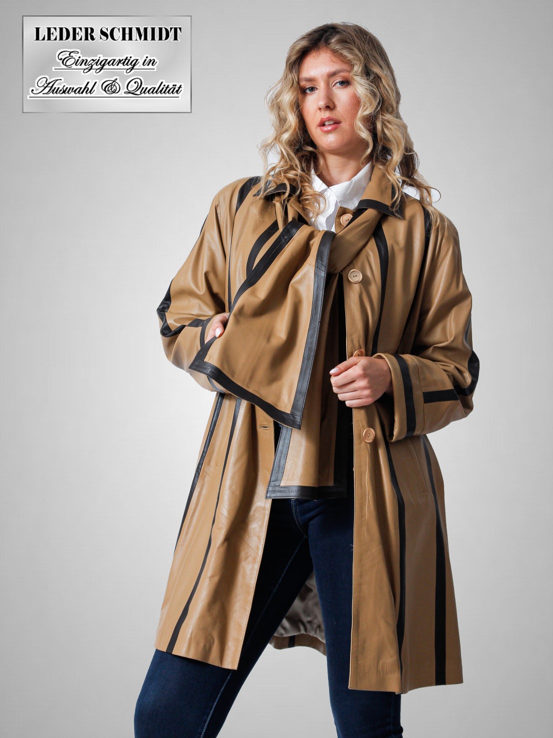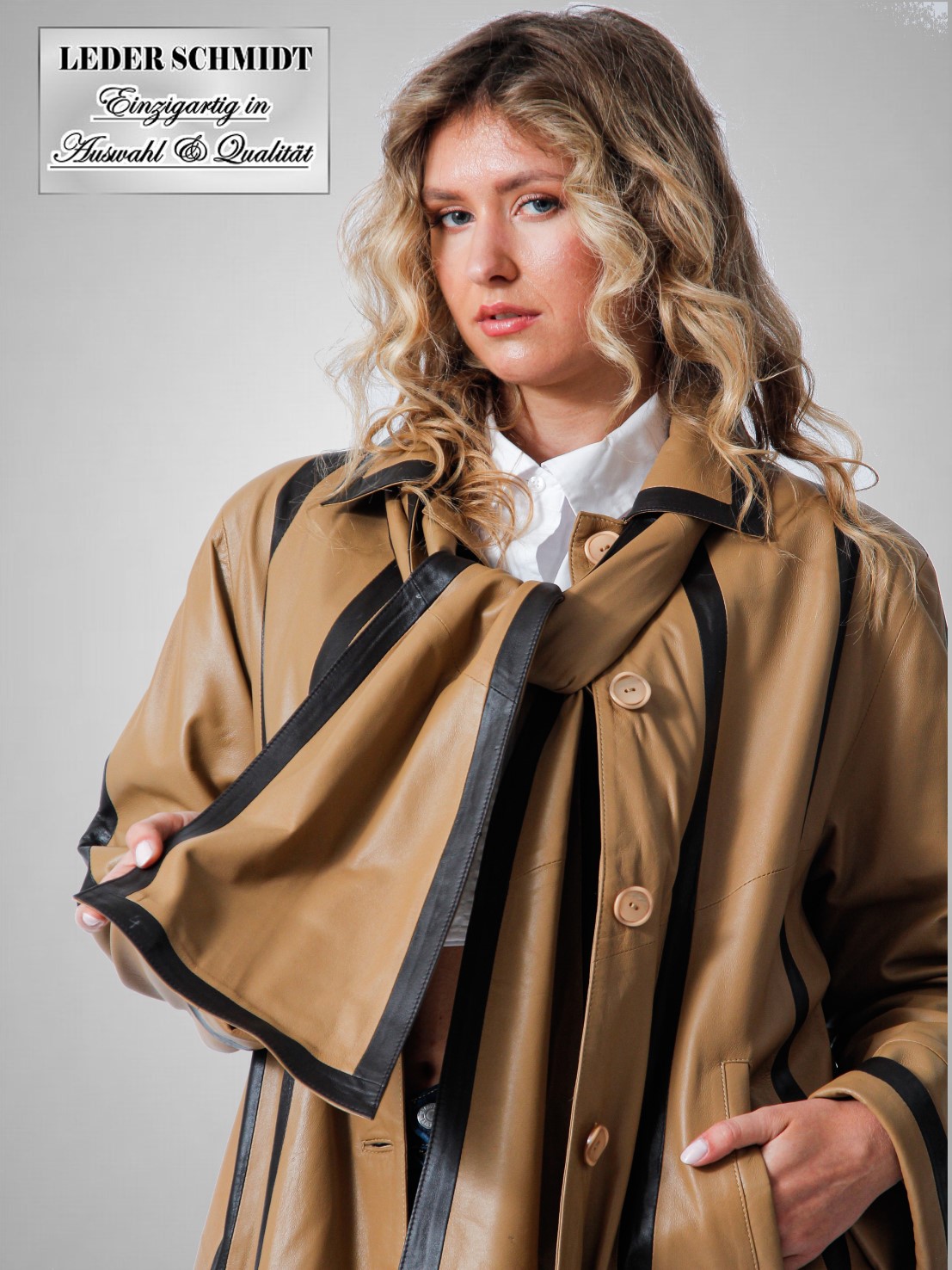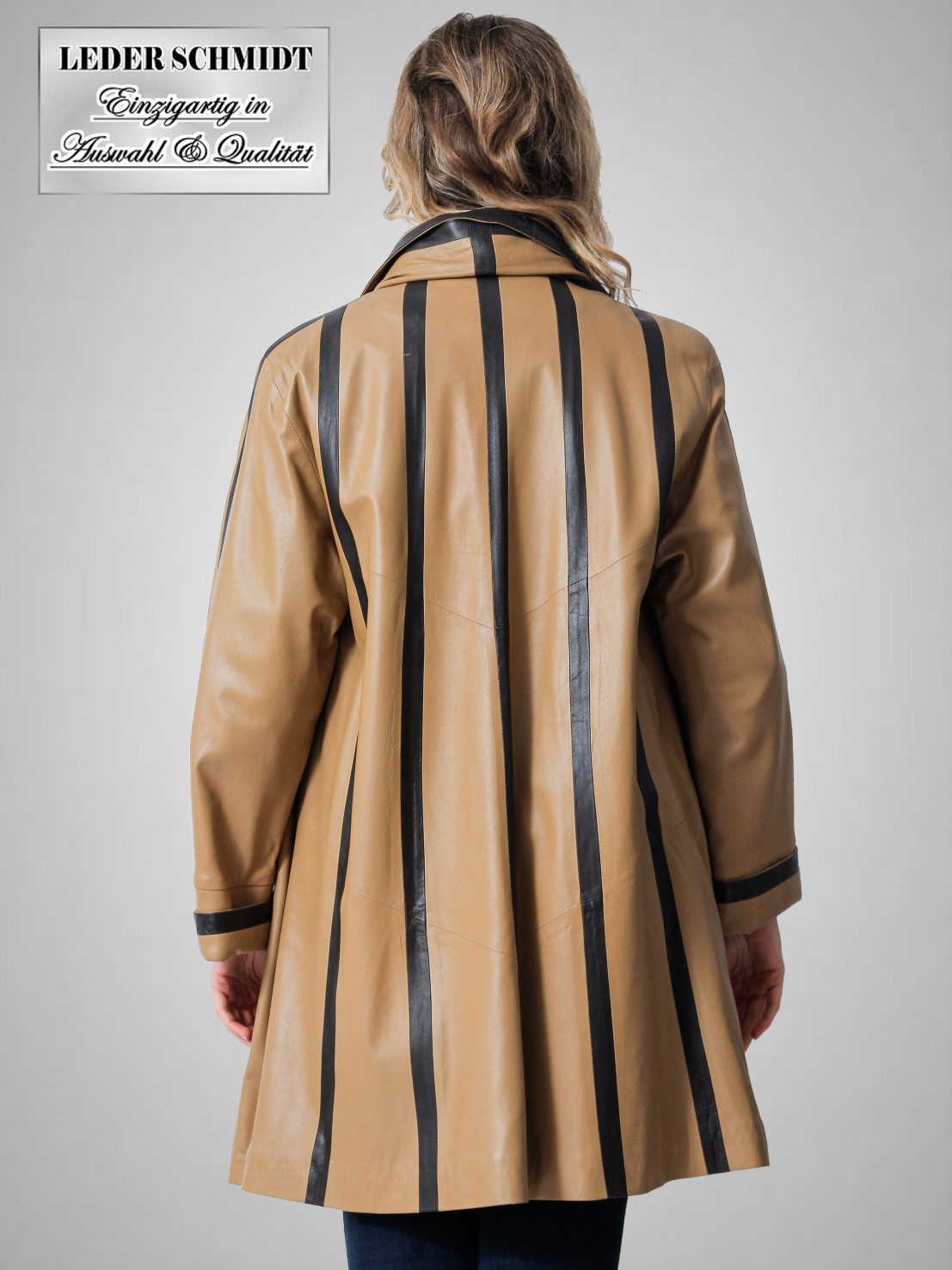 Der Lederkurzmantel hat eine weit geschnitte A-Form. Die dunkelbraunen Kontraststreifen verleihen ihm eine besondere Note.