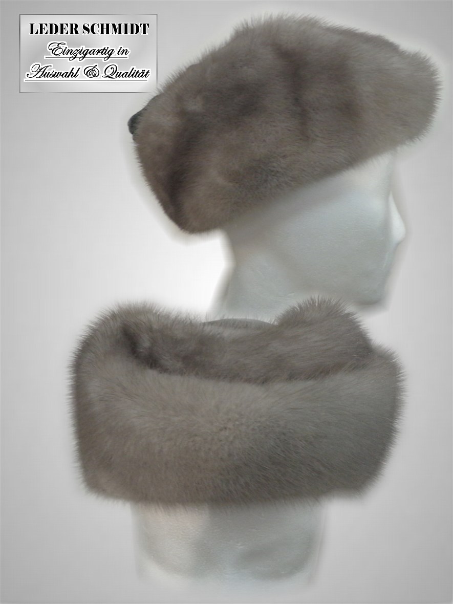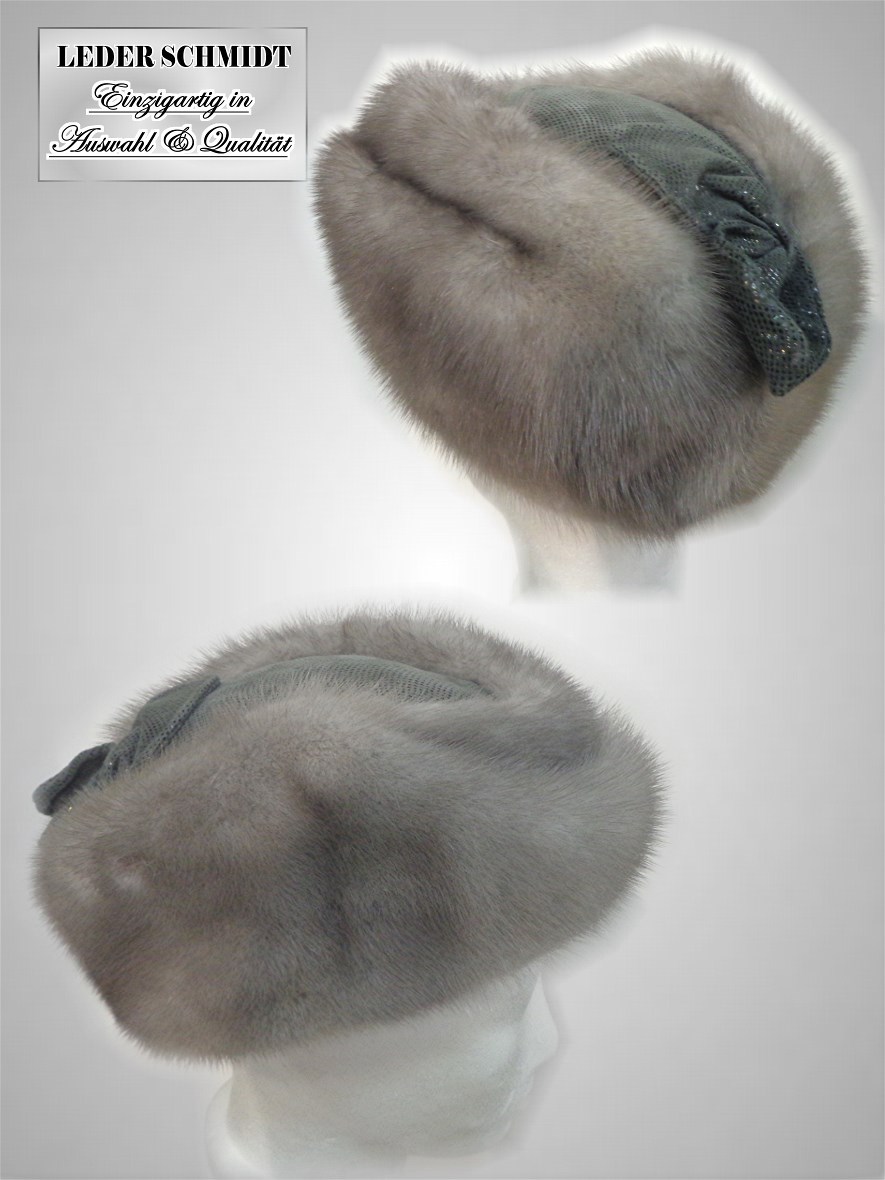 Exklusive Nerzkappe aus silbergrauem Saphirnerz und Leder.