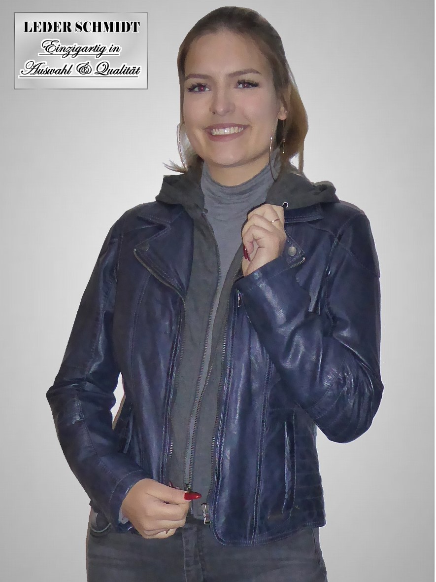 Damen Lederjacke im leichtem Vintage-Look mit abnehmbarem Kapuzenteil und Reverskragen (leichter Biker-Style). Das figurbetonte Modell ist aus handschuhweichem Lammnappa. Die Jacke hat zwei Einschubtaschen mit Reißverschluss. Das Kapuzenteil ist aus Baumwolle und kann mit einem Zipper entfernt werden. Die Ärmelenden mit Reißverschluss, das Modell hat mehrere Absteppungen und die Lederjacke hat zwei Innentaschen.