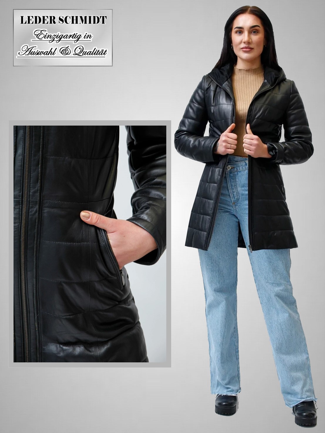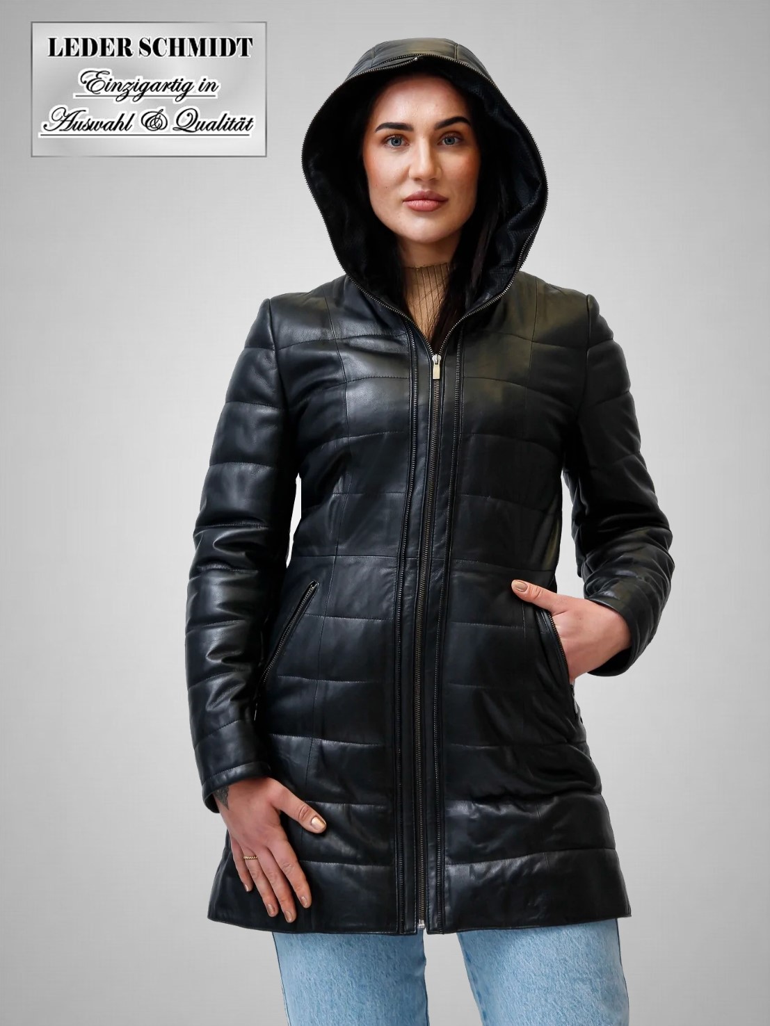 - Leder gesteppt mit fester Kapuze