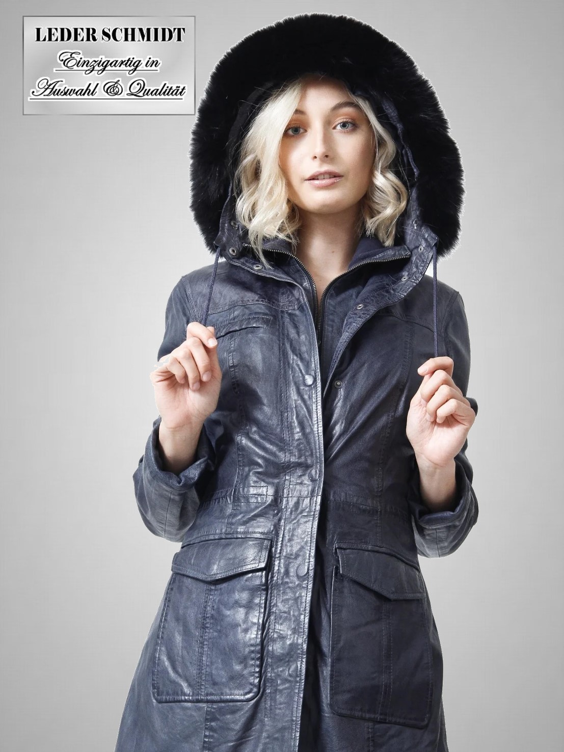 Damen-Lederparka aus superweichem Lammnappa in d.blau Vintage-Look.