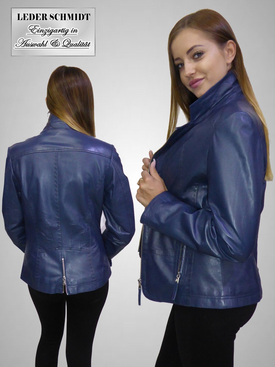 Diese Damen Lederjacke aus sehr weichem Lammnappa mit Reißverschluß ist im Blazerstil gearbeitet, hat zwei schräge Eingrifftaschen mit Reißverchluß sowie zwei Innentaschen. Die Jacke hat einen sehr leichten Vintagelook und ist figurbetont. Die Ärmellänge läßt sich durch einen Umschlag regulieren und die schicken kleinen Ziernähte machen das Modell perfekt. Die Rückenlänge beträgt bei Gr. 38 61 cm, bei Gr. 40 62 cm