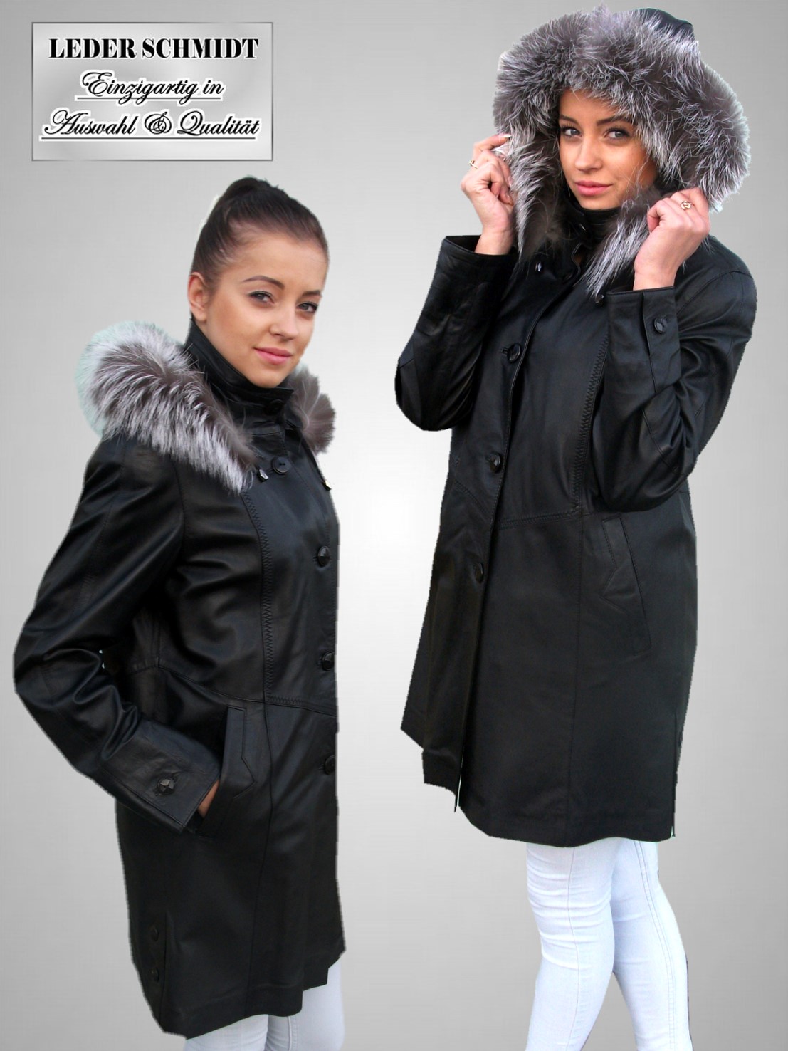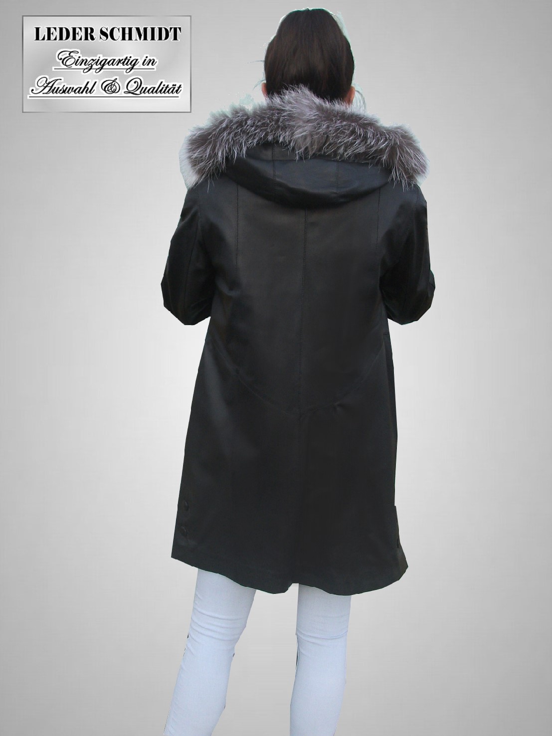 Lange leichte Damen Lederjacke in 1a Lammnappa mit Kapuze und echtem Pelzbesatz.