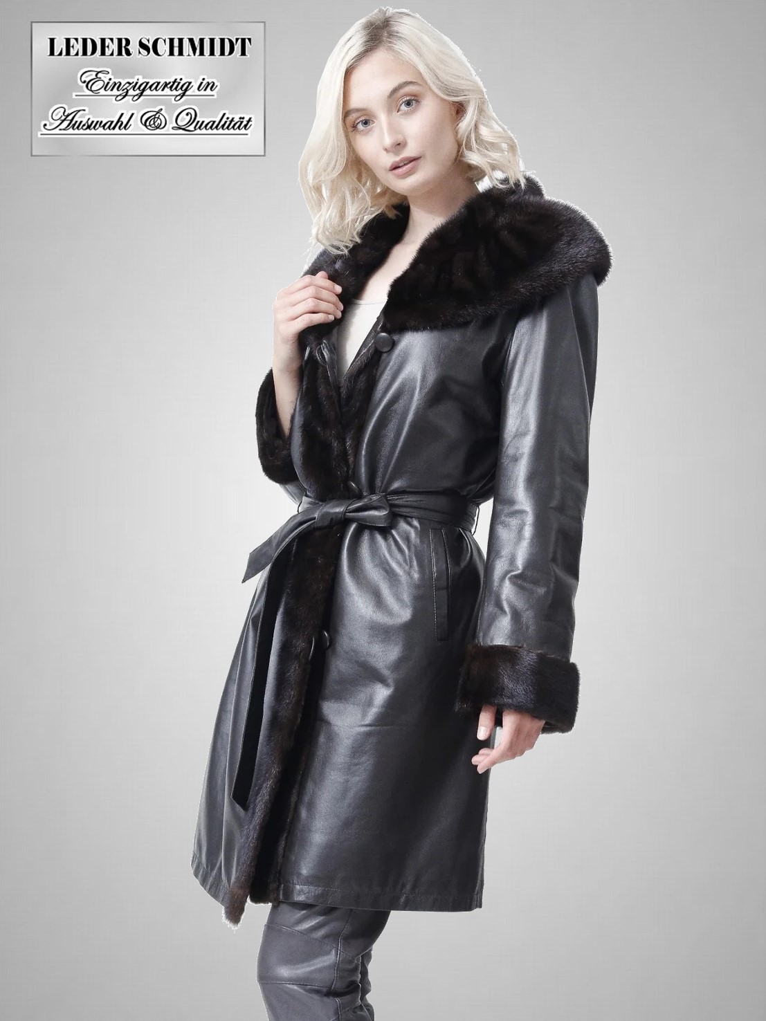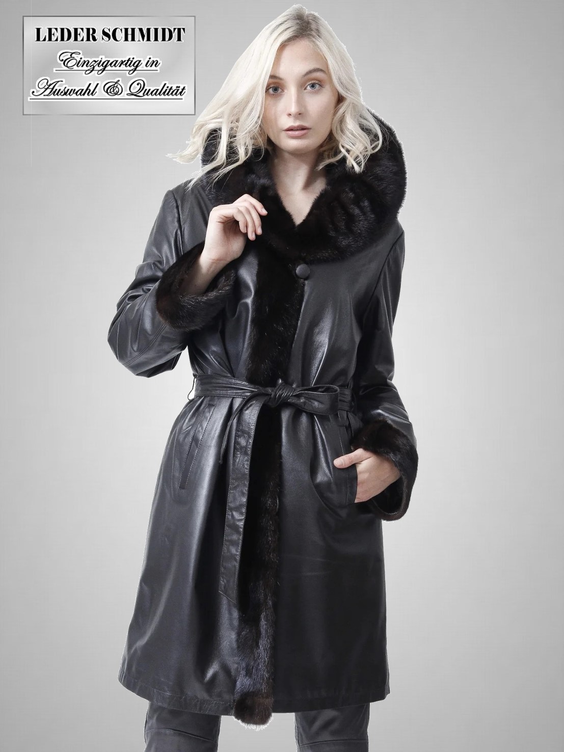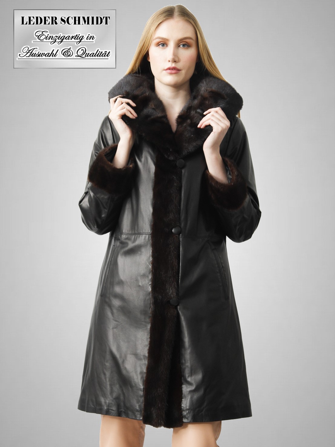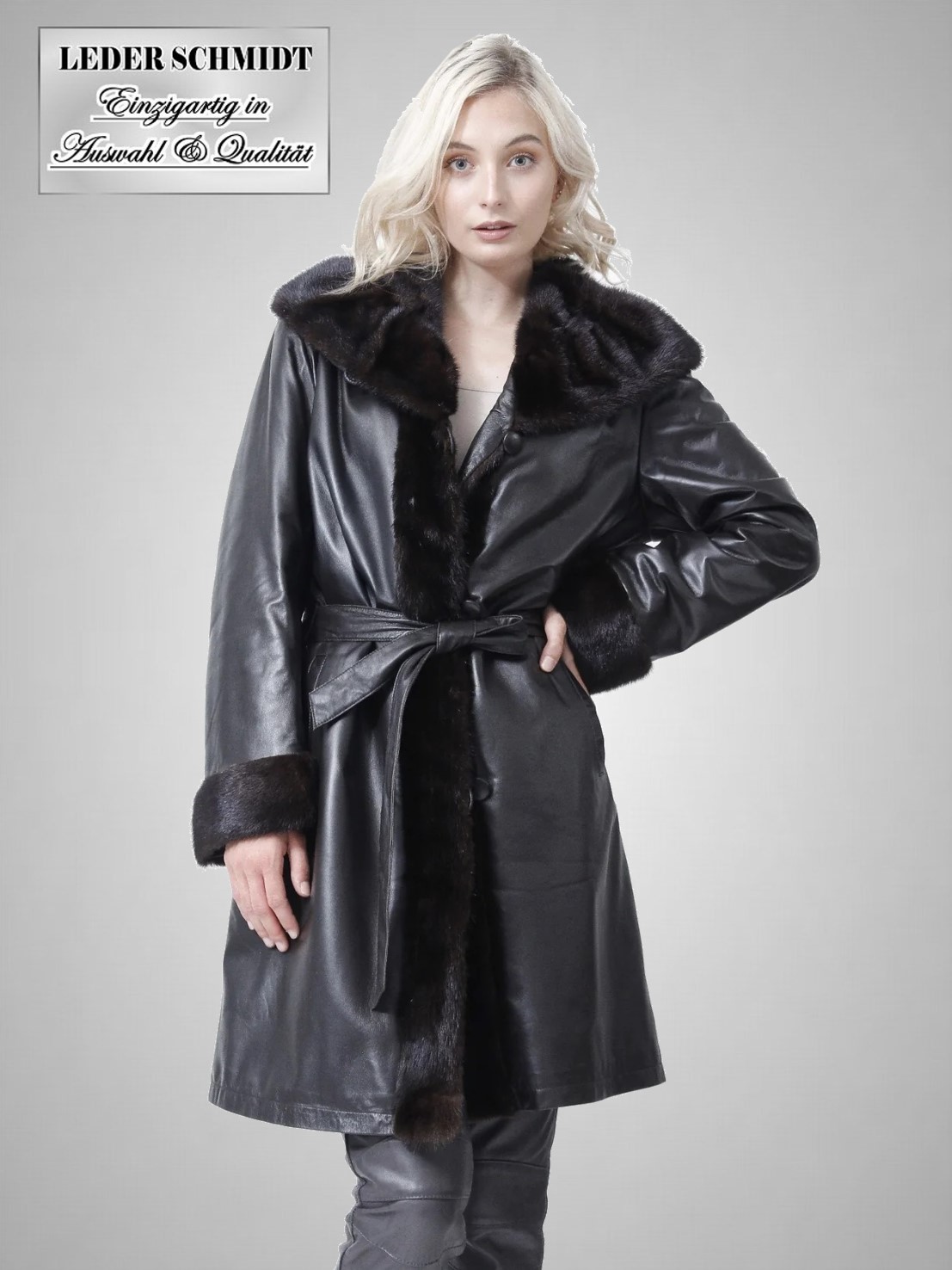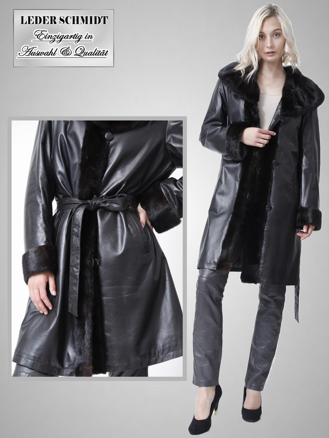 Ledermantel im aktuellen Look mit Pelz am großem Kragen, an den Ärmelstulpen und an beiden Vorderkanten (Pelz=