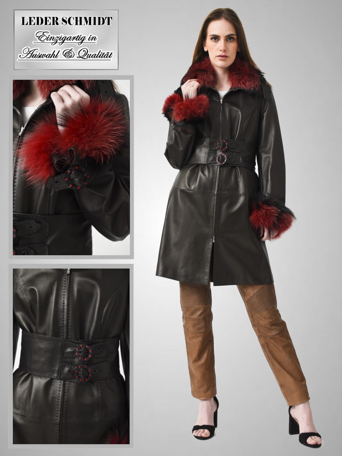 Lange Damenlederjacke in schwarz mit Blaufuchs Applikation
