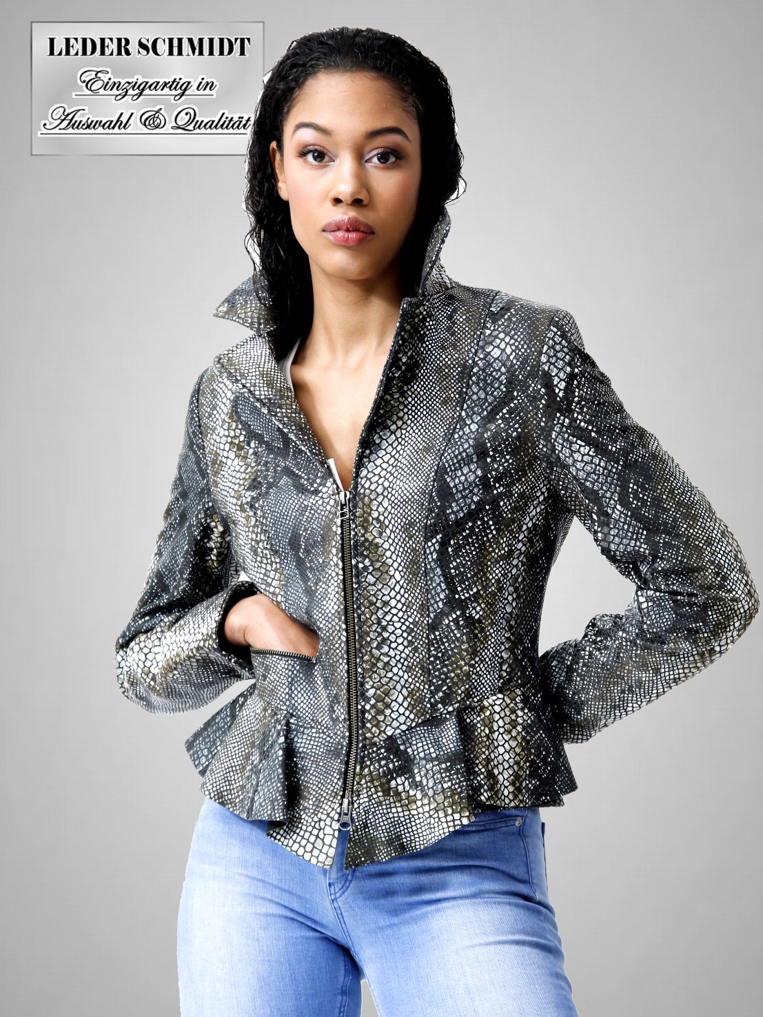 Extravagante kurze Damen-Lammnappa-Lederjacke in Schlangenoptik.