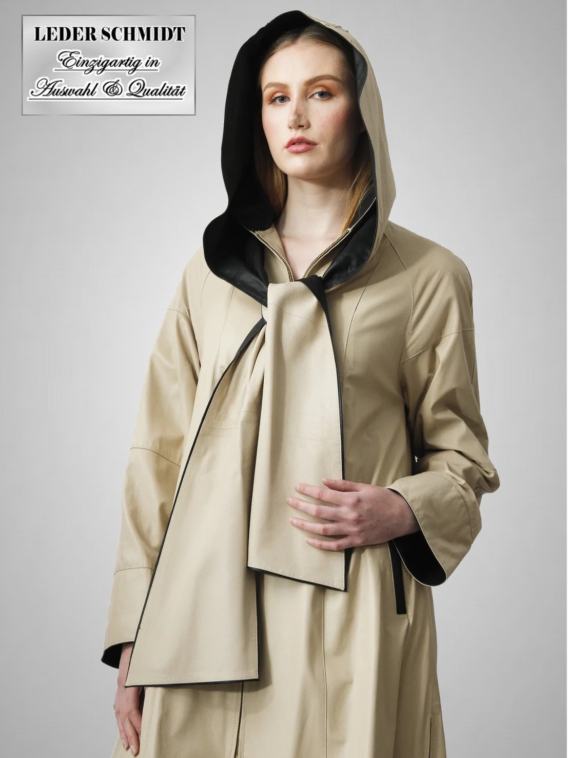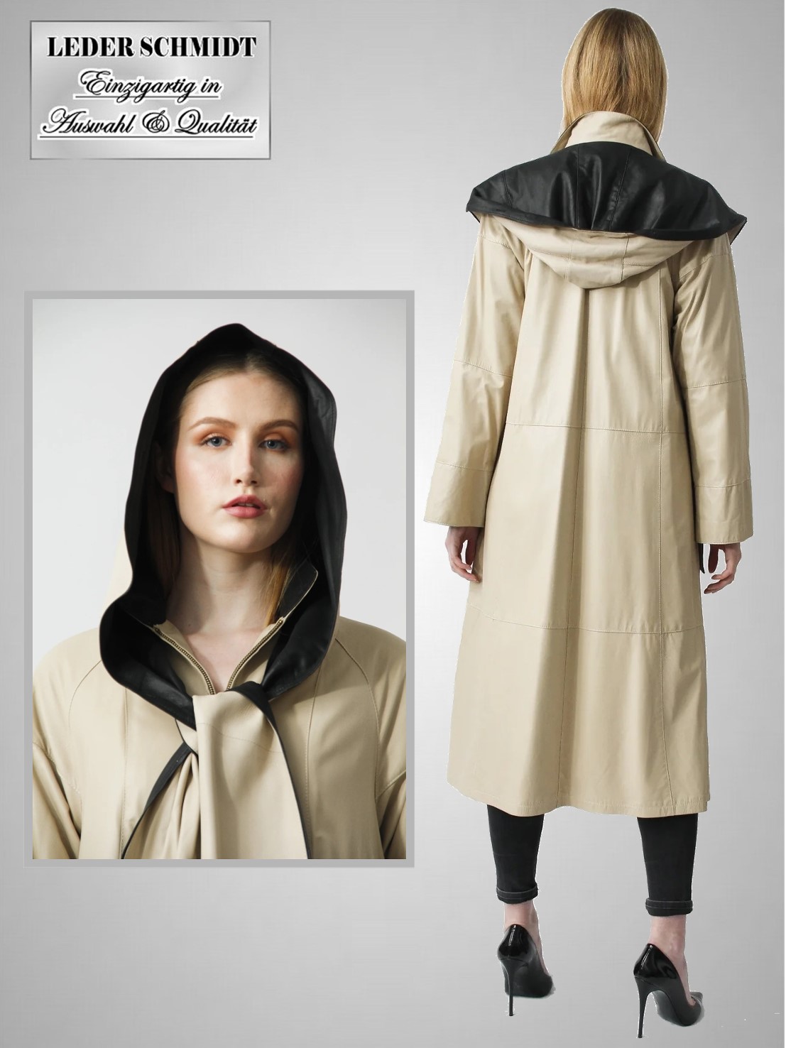 Dieser Mantel hat eine abnehmbare Schalkapuze, die beidseitig aus Leder ist. An den Seiten unten rechts und links ist jeweils ein Reißverschluss von einer Länge von 50cm eingearbeitet. Der Mantel hat zwei Einschubtaschen sowie eine Innentasche.