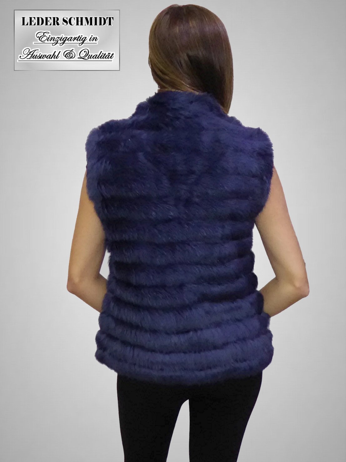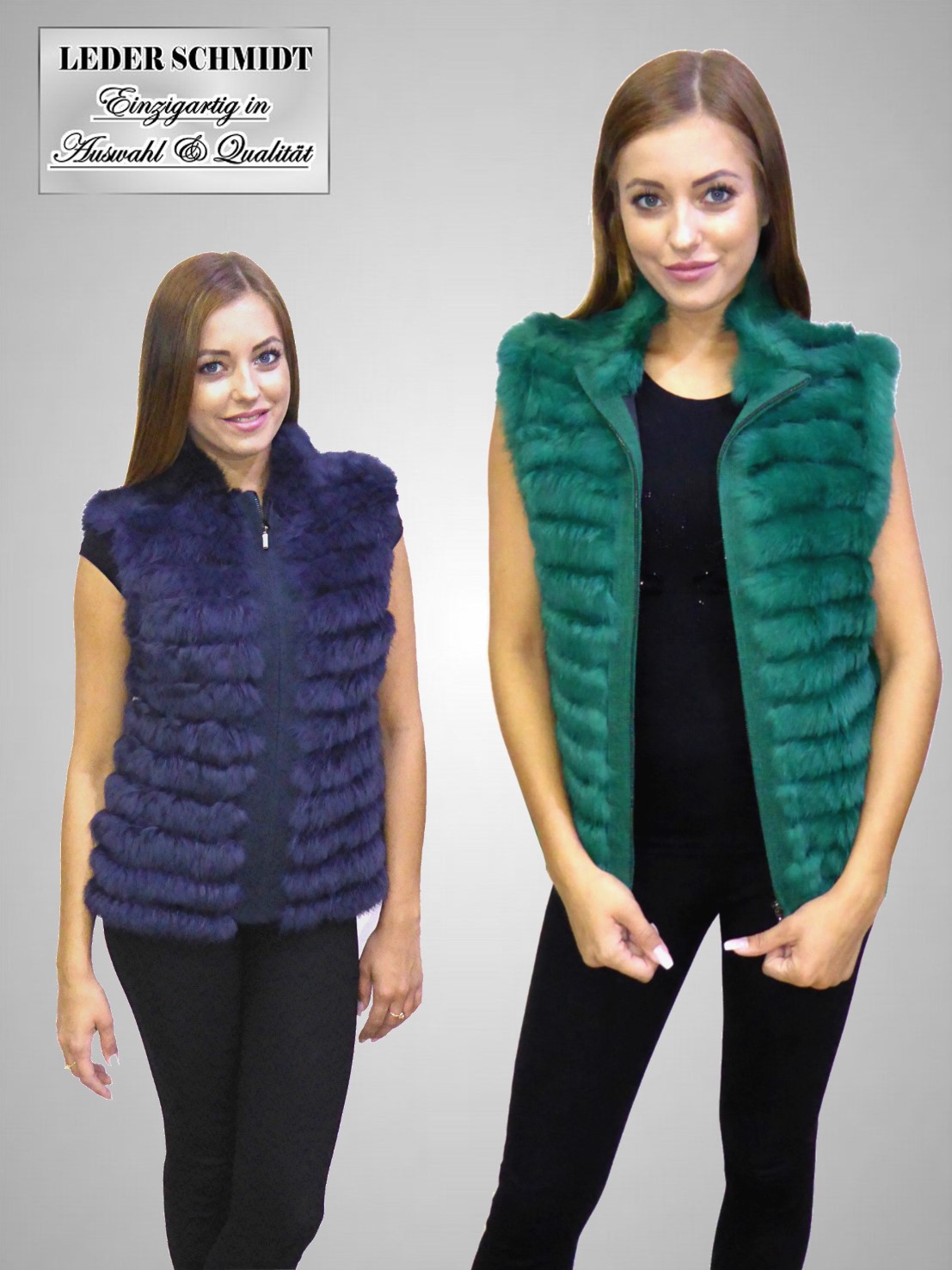 Pelzweste aus Kaninchen in verschiedenen Farben (Strick zwischen den Bahnen) mit Reißverschluss.