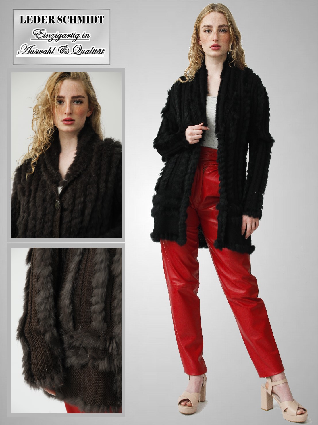 Hochwertige lange Damen Strick-Jacke mit Kaninchenfell in der Farbe schwarz und dunkel braun.