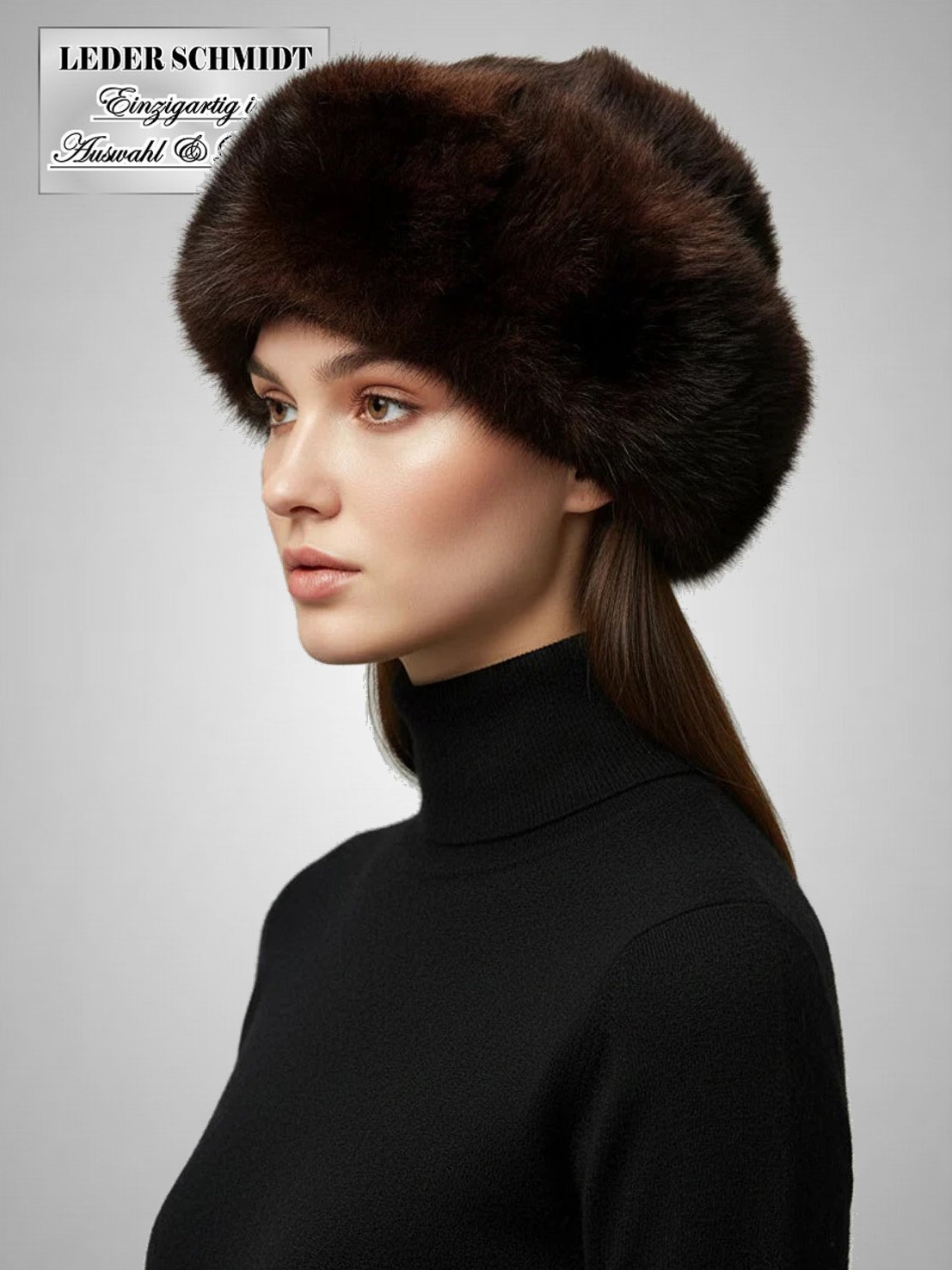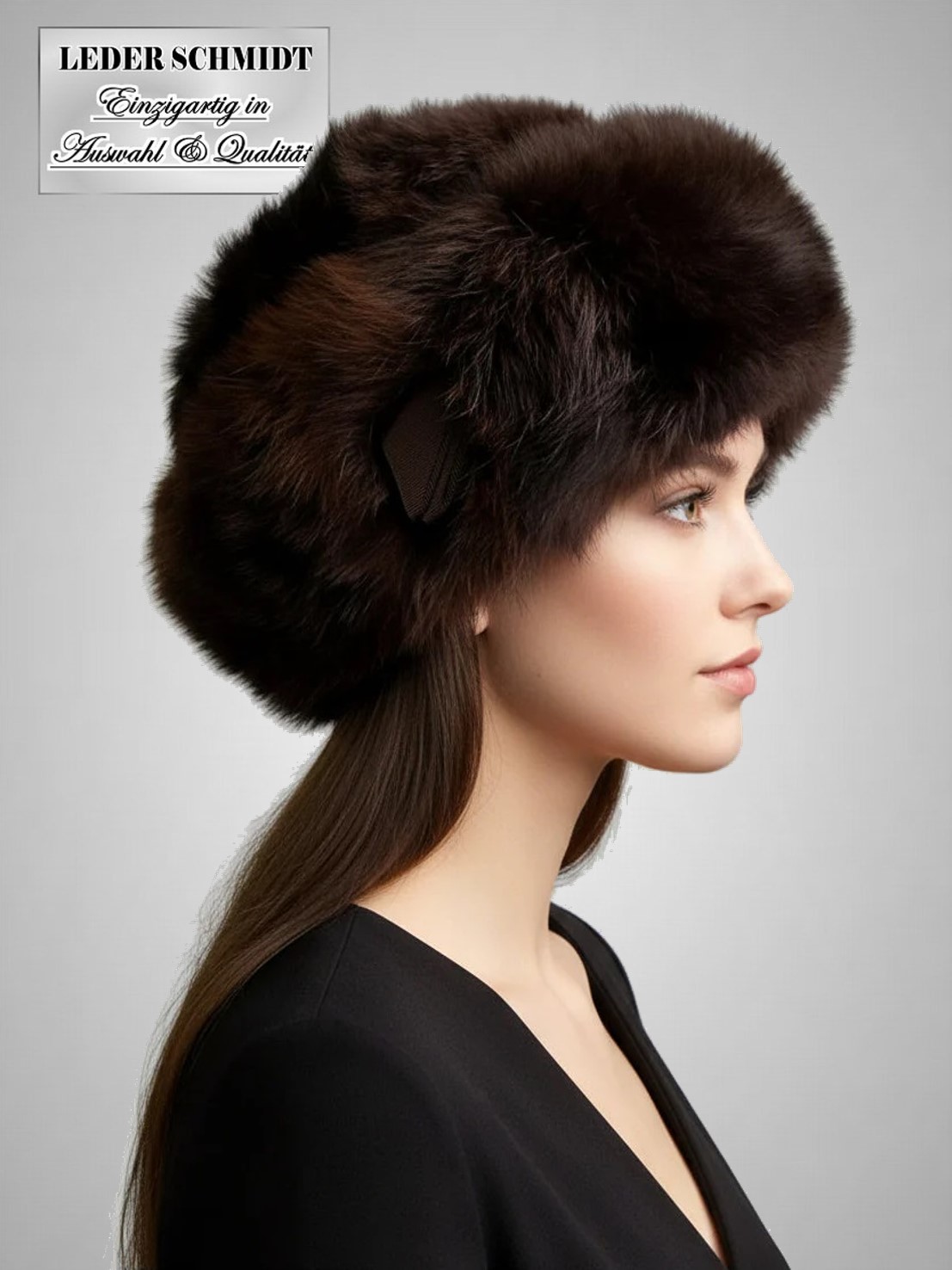 Die Brauntöne sowie die natürliche Haarstruktur können variieren und machen jede Mütze zu einem Unikat.