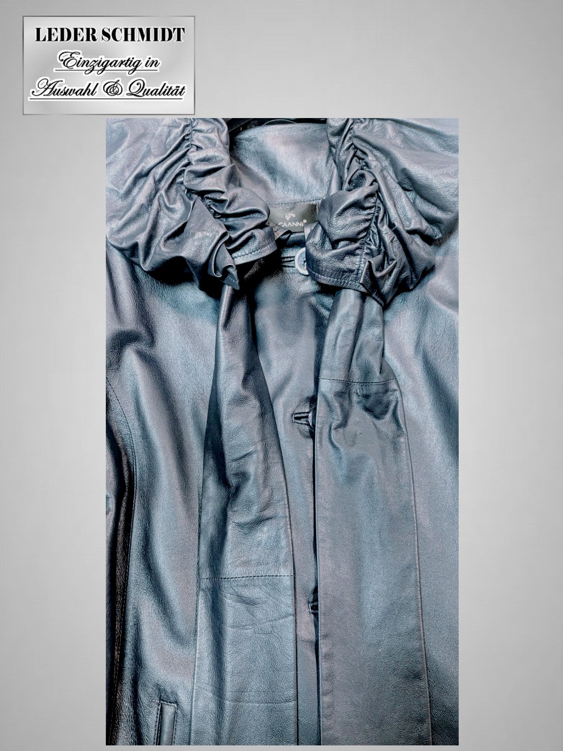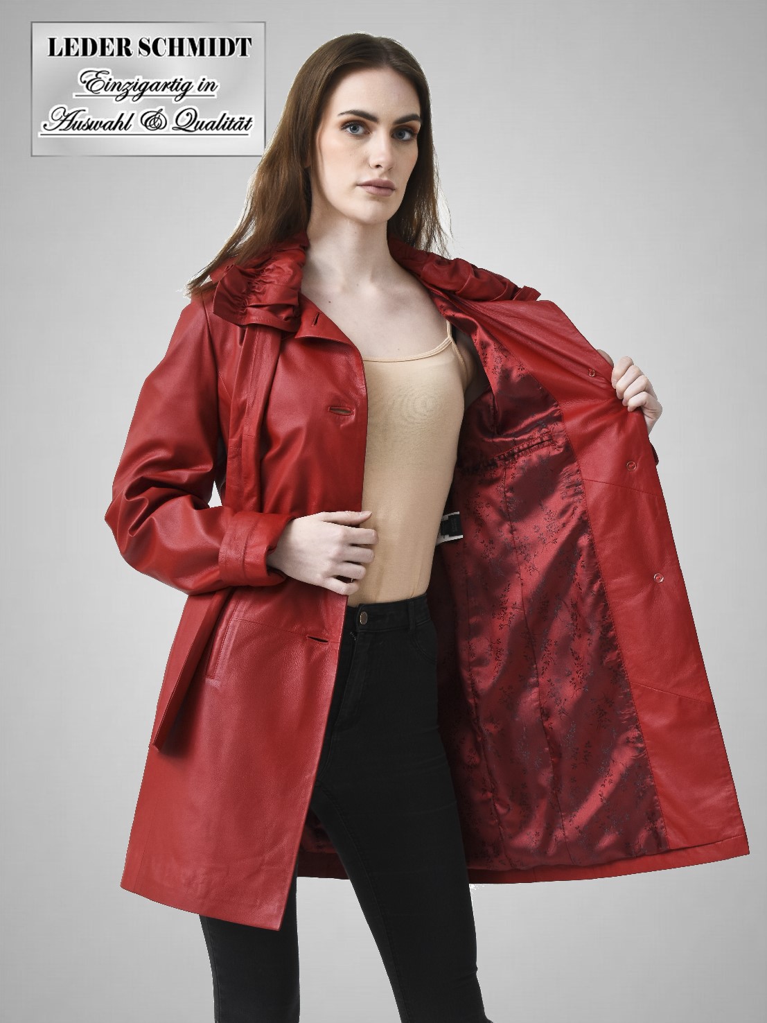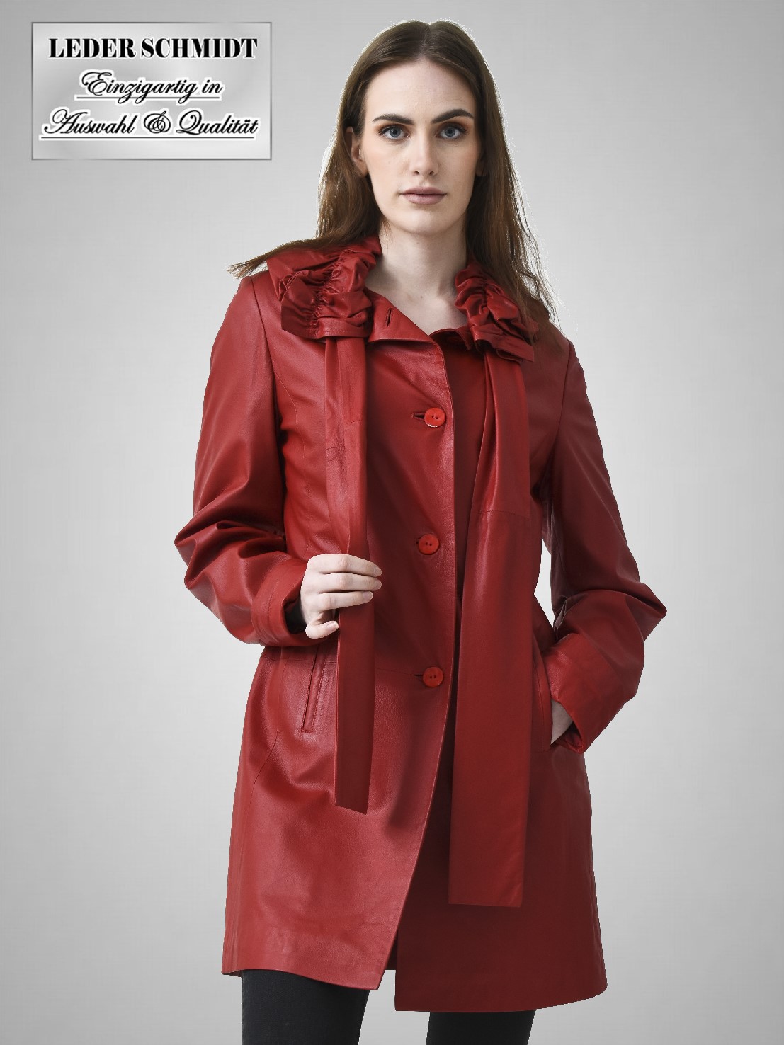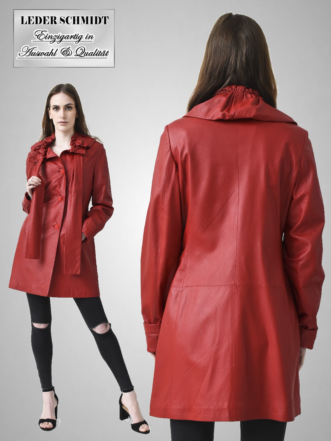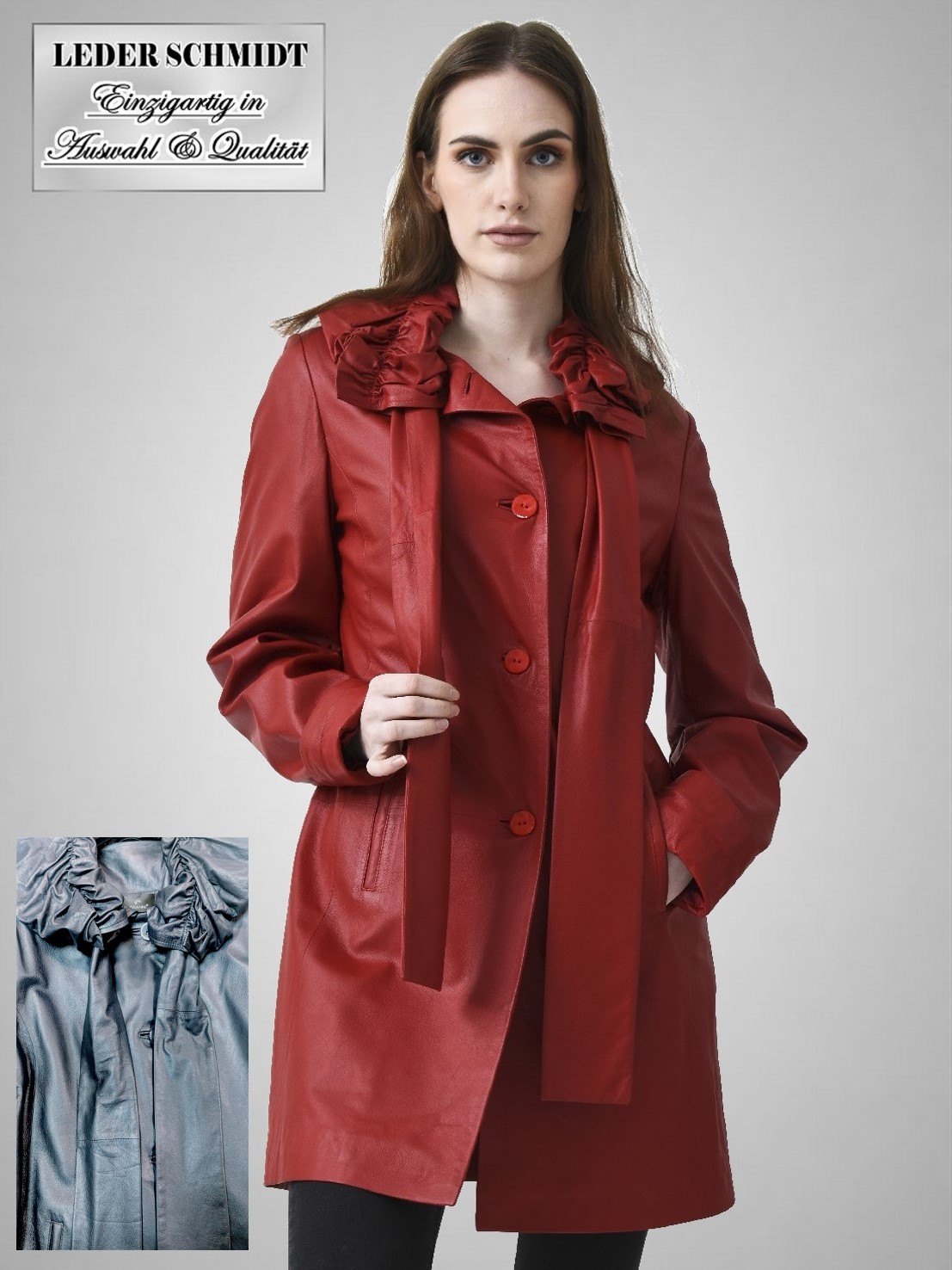 Der Ledermantel ist leicht tailliert und wird mit Knöpfen geschlossen. Er hat zwei Einschubtaschen und eine Innentasche. Ein Highligth dieses besonders leichten und dünnen Kurzmantels ist der extravagante, geraffte Kragen. Das Modell in Farbe rot hat, anders als abgebildet, keinen Schal. Die extralangen Ärmel können mit einem kleinen Umschlag getragen werden.