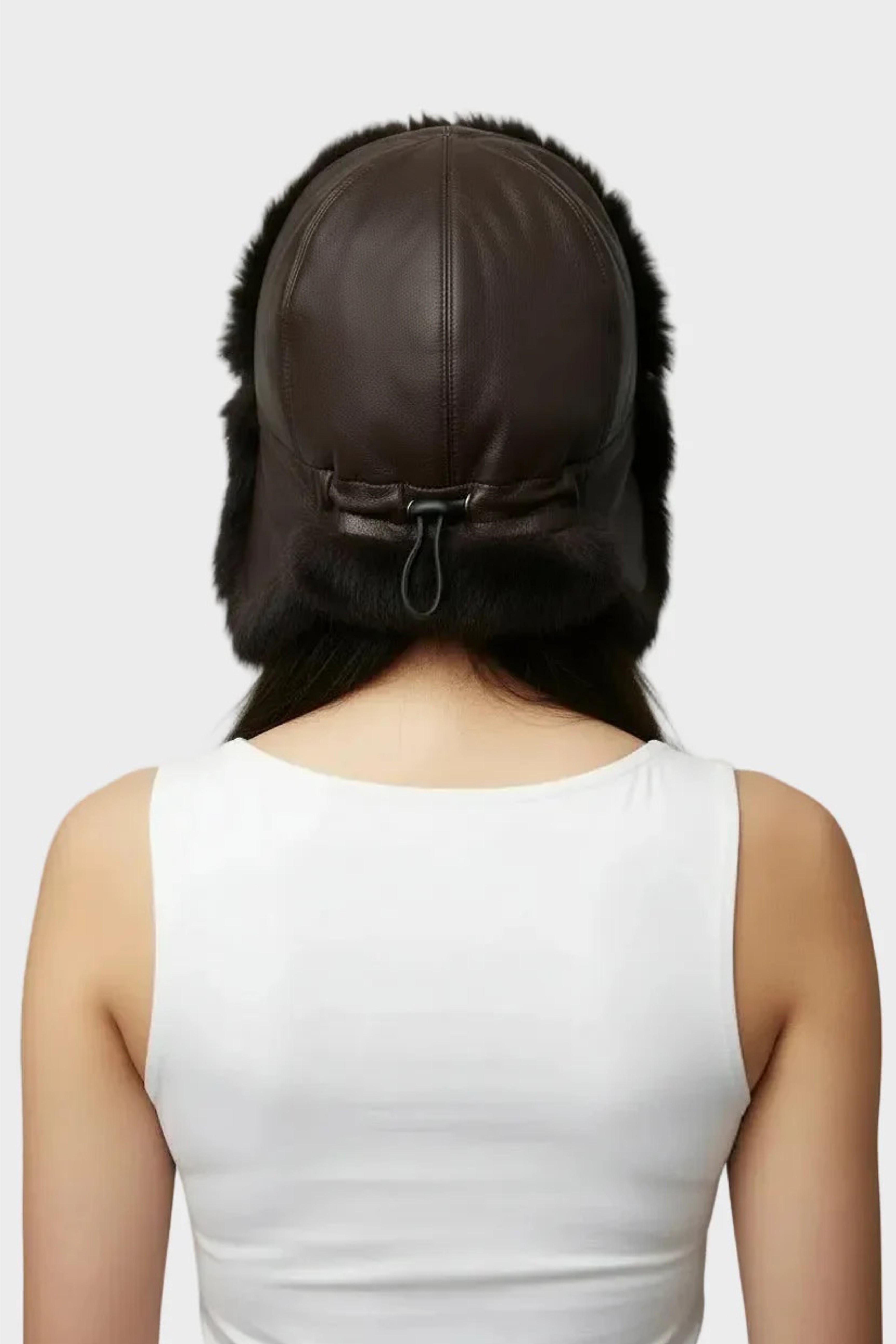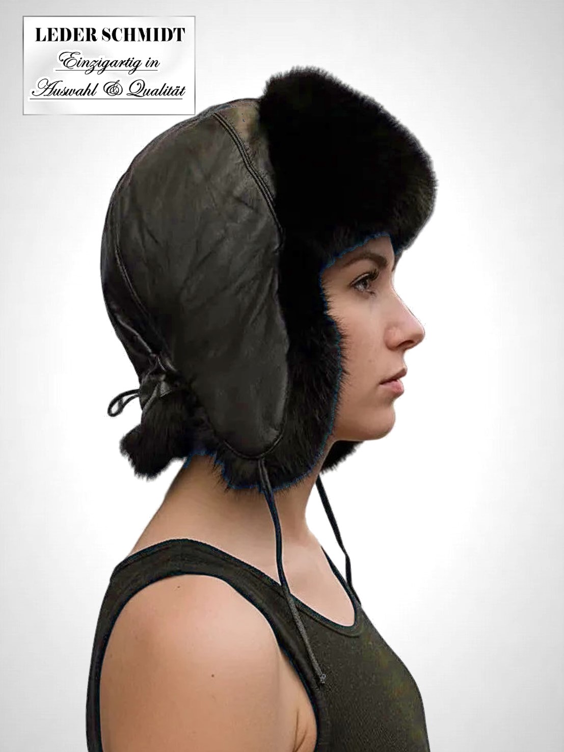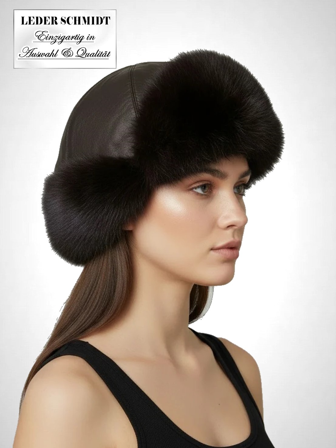 Damen Ledermütze dunkelbraun mit Kaninchenfell.