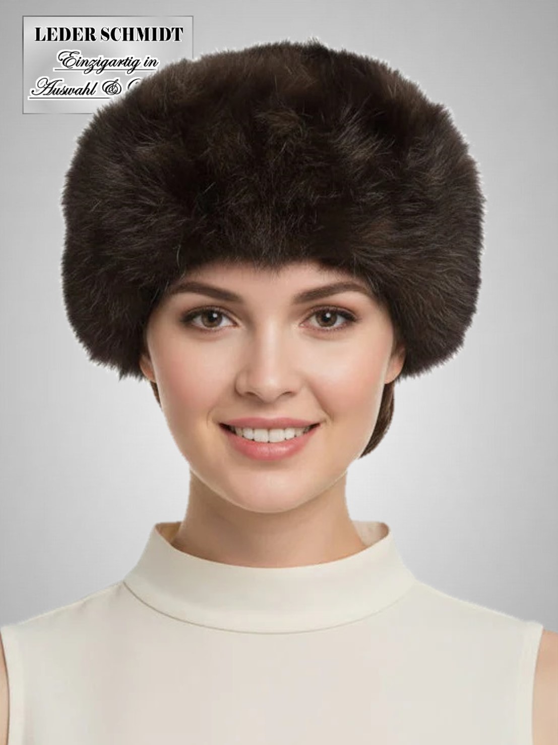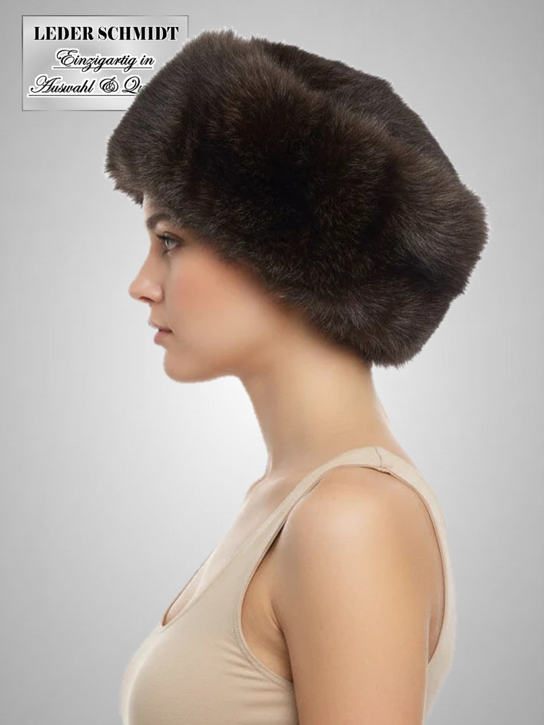 Die Brauntöne und natürliche Haarstruktur können variieren und machen jede Mütze zu einem Unikat.