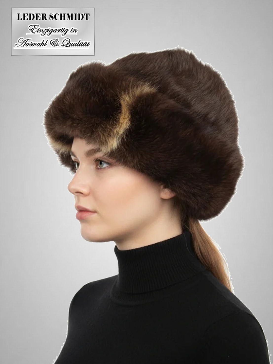 Die Brauntöne und natürliche Haarstruktur können variieren und machen jede Mütze zu einem Unikat.