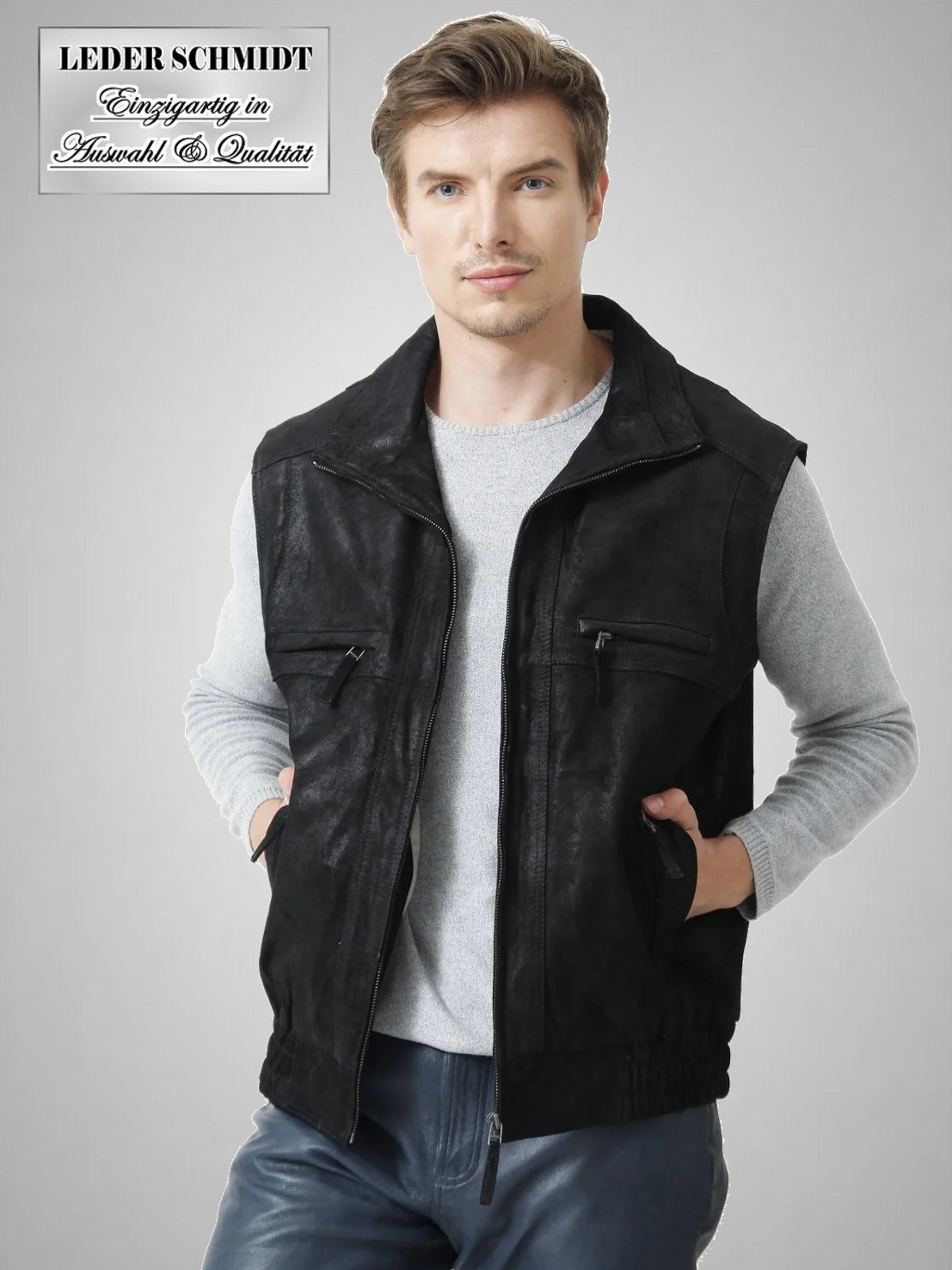 Sportliche Herren-Jeder Weste schwarz aus Pork-Leder.