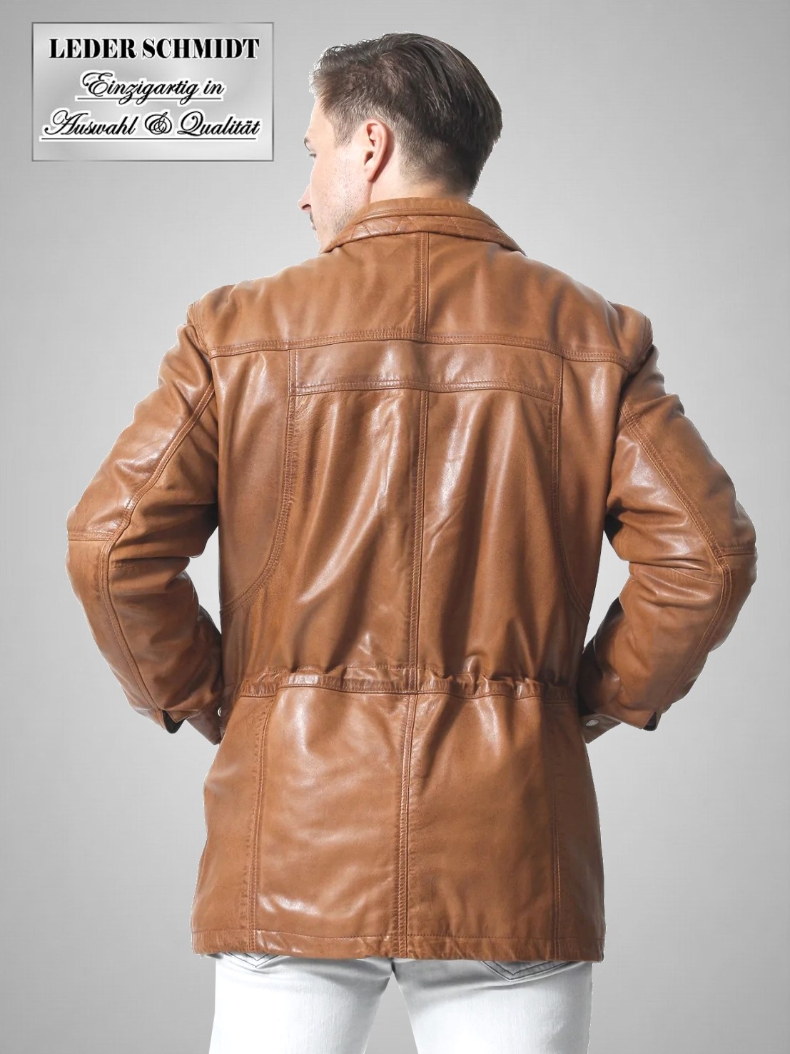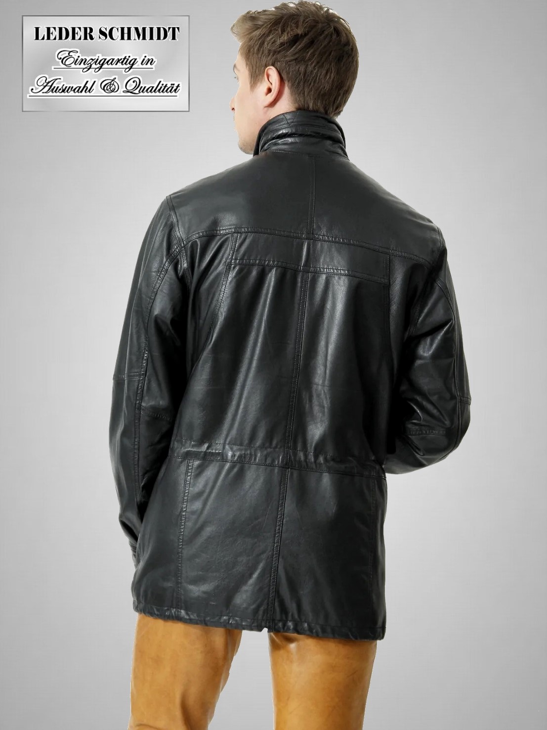 Sie erhalten ihn in den Farben schwarz, cognac und blaugrau im aktuellen Vintage-Look. Der Frontreißverschluß ist hoch schließbar und mit einer Deckleiste versehen. Der Leder-Parka hat zwei Brusttaschen und vier schräge Einschubtaschen (zwei mit Reißverschluss), außerdem drei Innentaschen, eine davon mit Zipper. Am Kragen, in Taillenhöhe und am Saum sind Tunnelzüge eingearbeitet. Das Armbündchen läßt sich mit einem Drucker schließen.