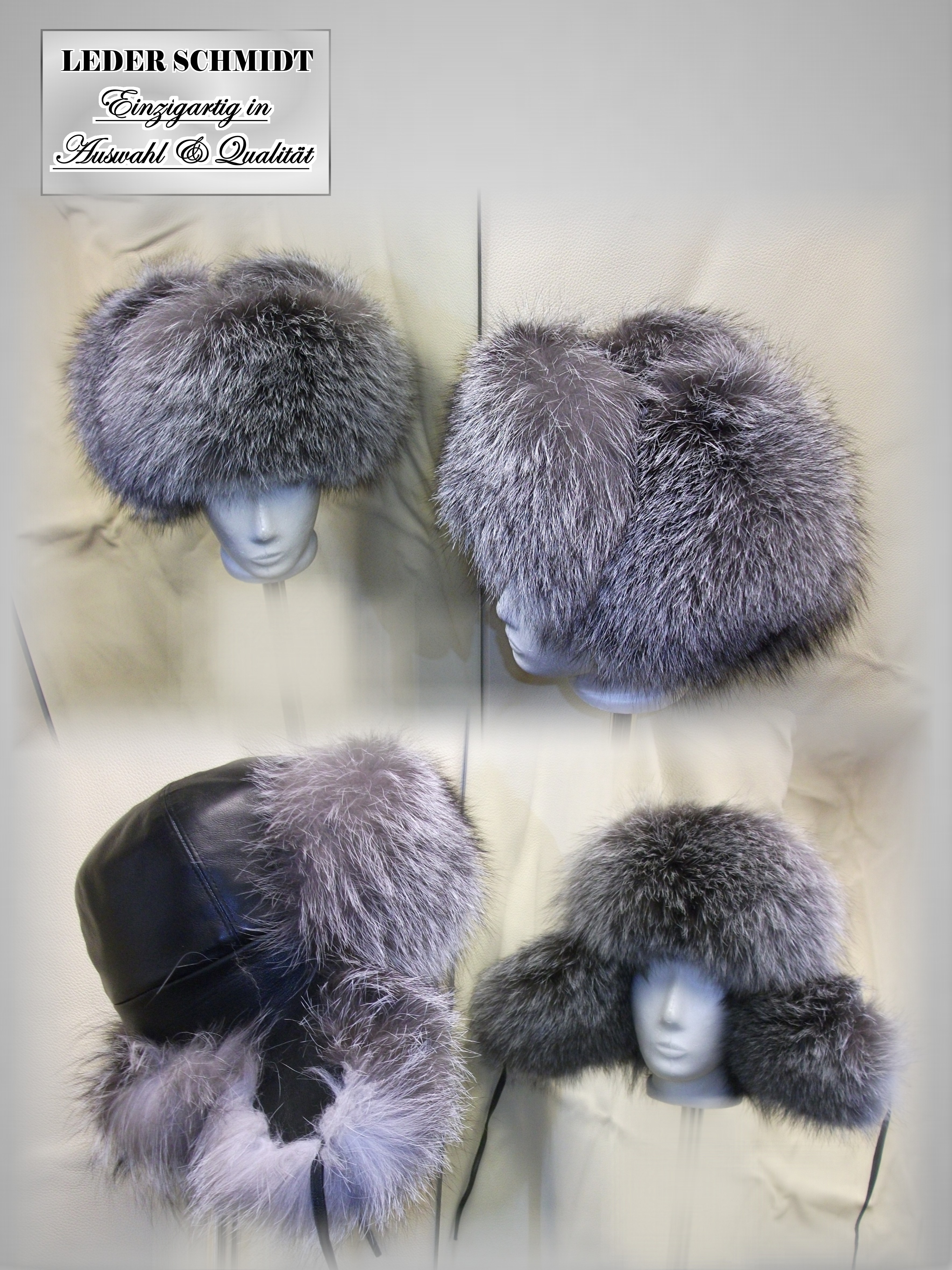 Exklusive hochwertige Silberfuchstschapka aus echtem Silberfuchs und schwarzem Velourleder (Abbildung Glattleder).